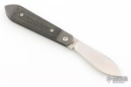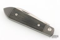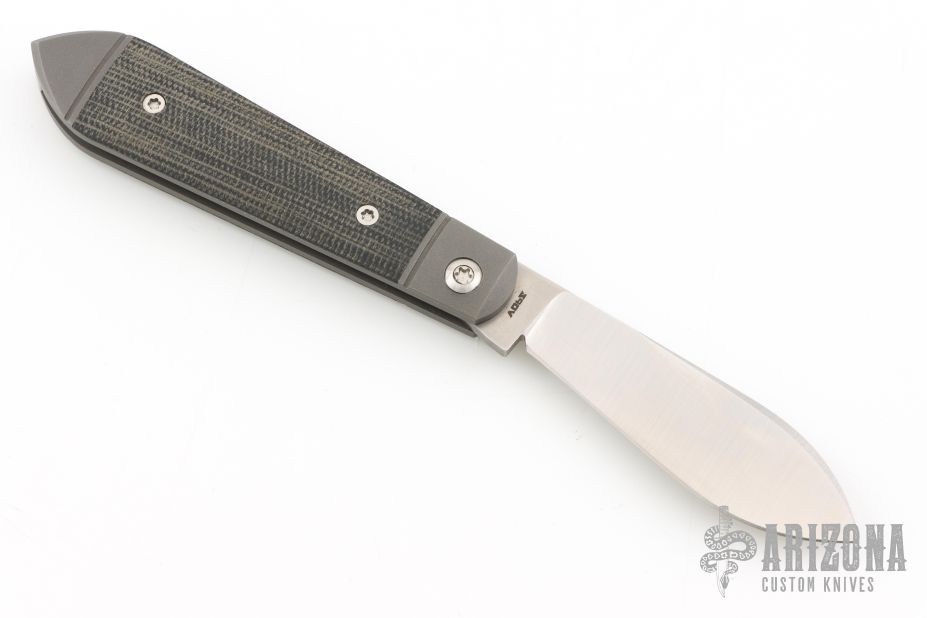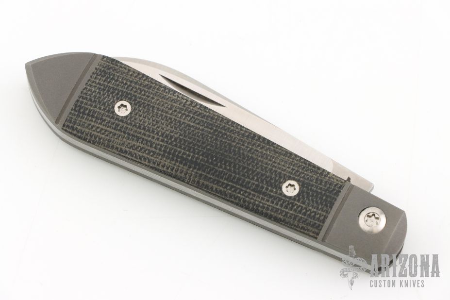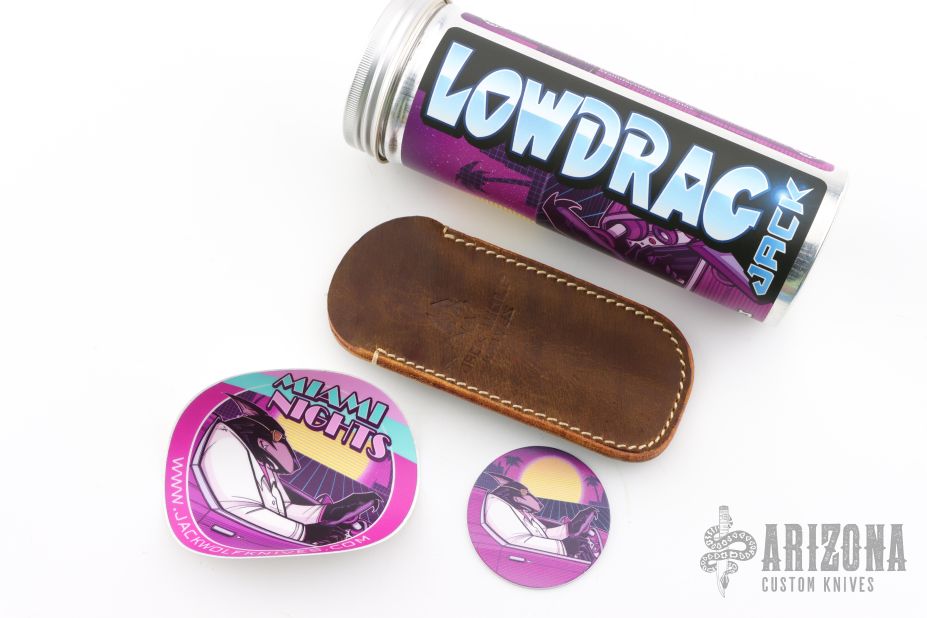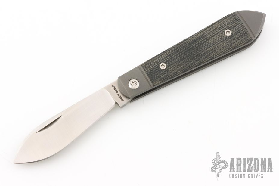This Low Drag Jack is a Teardrop slipjoint model by Jack Wolf Knives featuring a satin finished drop point blade with nailnick. The handle has integral bead blast finish pinched and fluted titanium front and rear bolsters and liners, black micarta scales with a stainless spring. Comes with box, metallic tube with Sean Tiffany artwork, leather slip, sticker and microfiber cleaning cloth. Excellent condition.