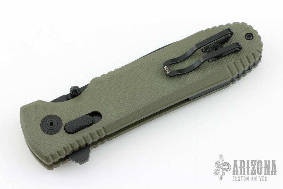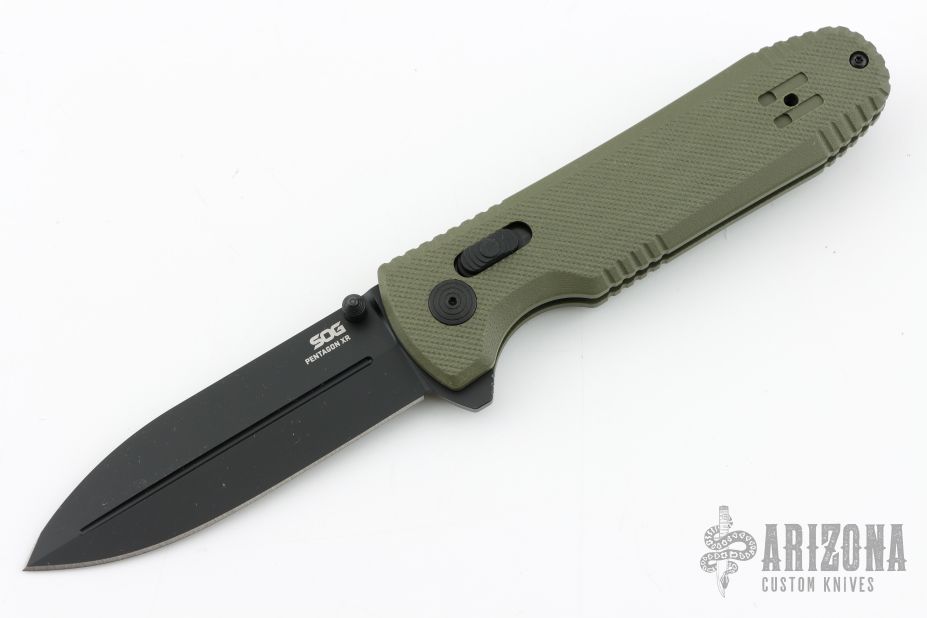 The SOG Pentagon XR is a full-size tactical knife that is perfect for a pocket of a soldier, police officer, or responsible citizen. This knife has a dagger grind, with the top being mostly unsharpened. The quarter inch nearest the tip on the dull side is sharpened, making this knife pierce deeply and easily. The handle is made of coarsely textured G-10. The blade opens with either the thumb studs or flipper tab, and locks up with the XR lock.