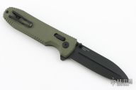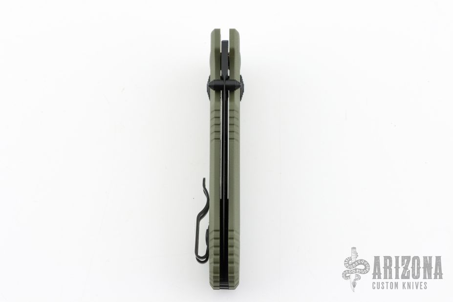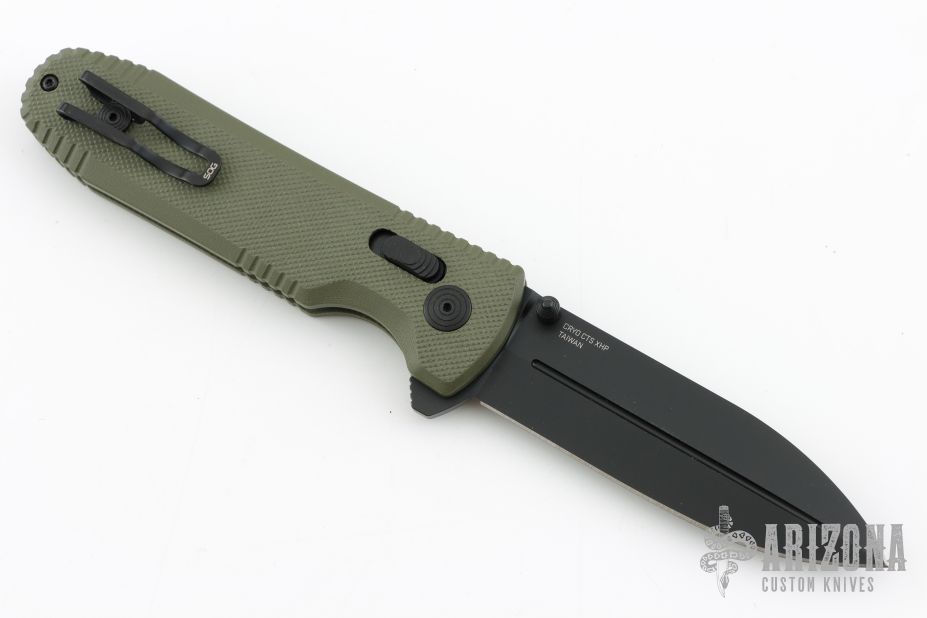 This Pentagon XR has an OD Green G-10 handle and a black finished XHP blade.
