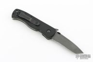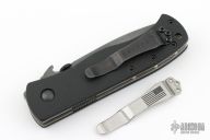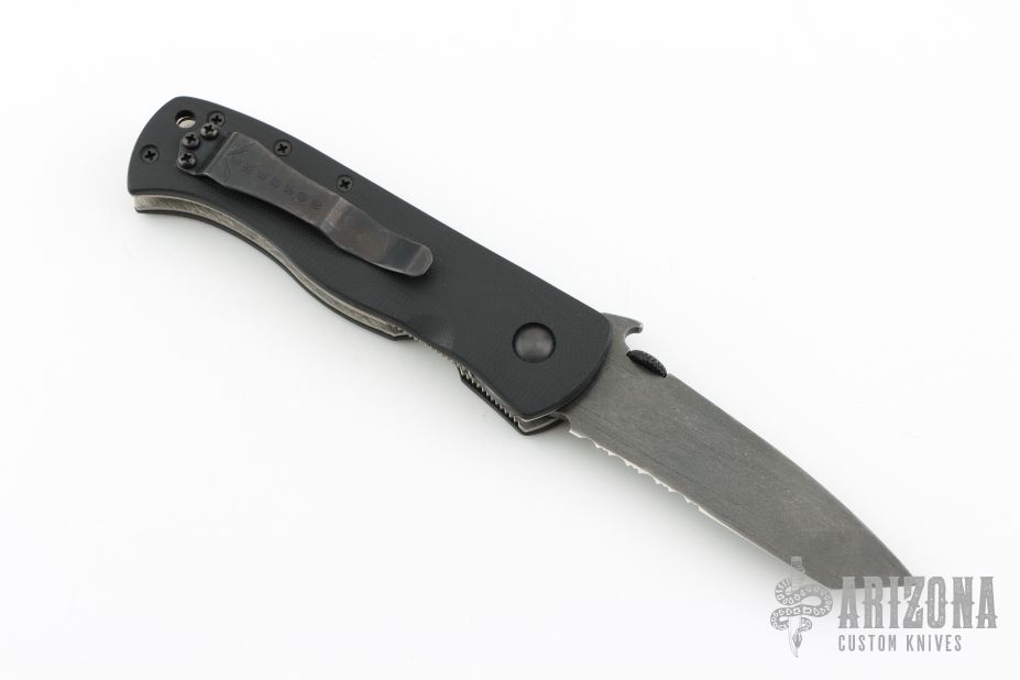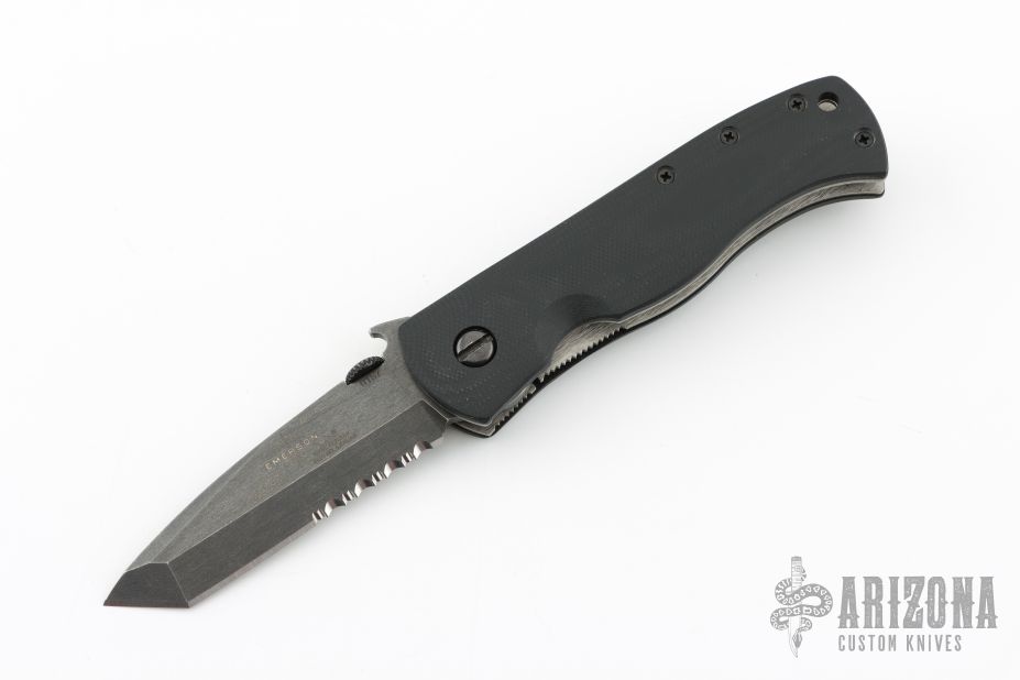 This CQC-7 by Emerson Knives has a tanto chisel ground partially serrated blade with notched thumbrest, wave features and a single thumbstud. Has contoured black G-10 scales, titanium liners, barrel spacers, and a tip up black stainless clip. S/N 0157. Nice detent, lockup and blade seating. Includes an Emerson box and papers. Excellent Condition.