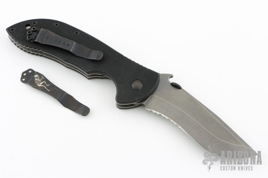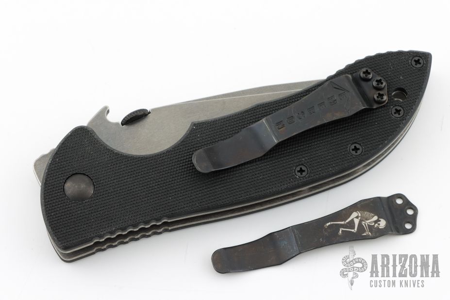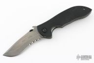 This production Commander linerlock folder has a recurve partially serrated blade and black G10 handle. Wave feature. #0645. Comes with an Emerson box and papers. Excellent condition.