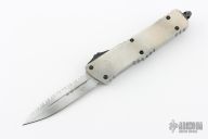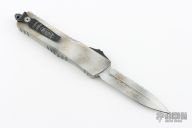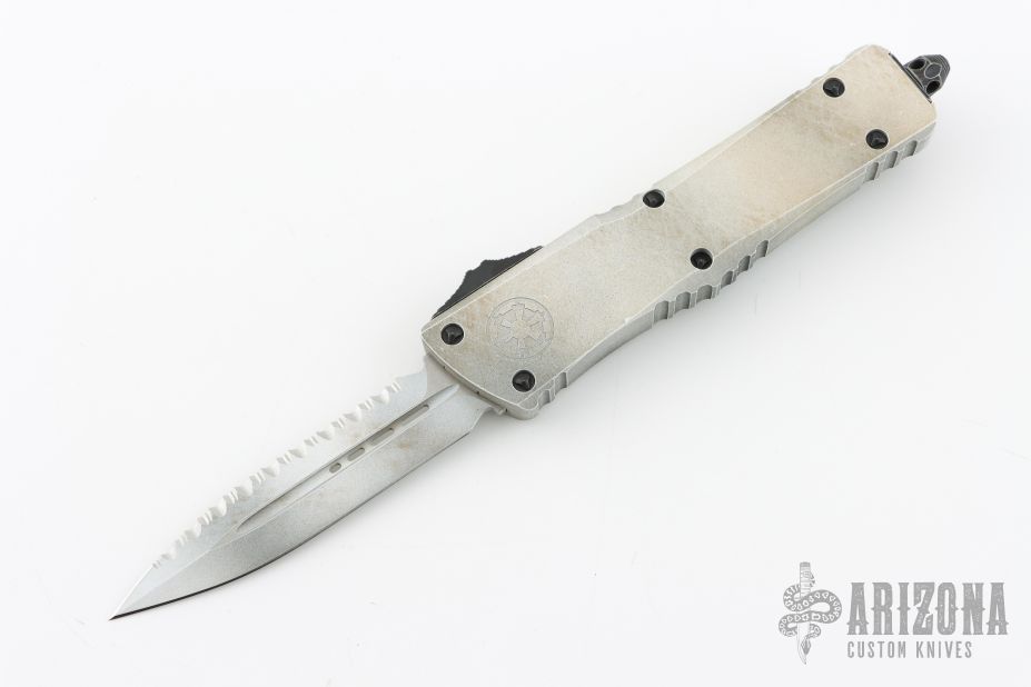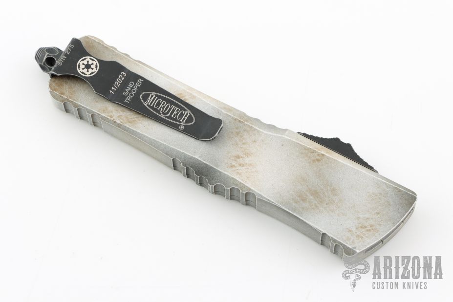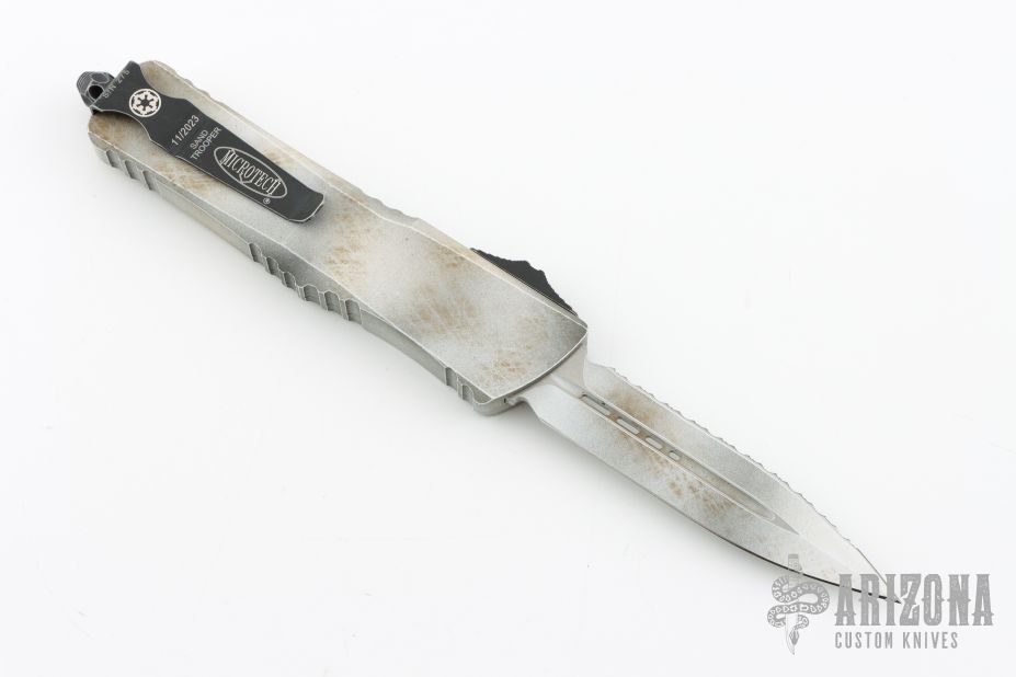 This Combat Troodon OTF automatic features a D/E blade with one fully serrated edge. The handle is composed of a Sandtrooper finished aluminum frame. Stainless steel clip. Glass breaker. 11/2023, S/N 275. Excellent condition. Comes with original box and papers.