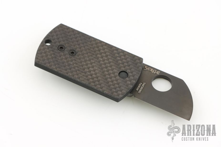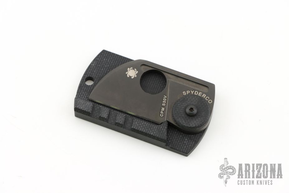 The DogTag Knife from Spyderco is a Serge Panchenko design, it is a unique knife design that can easily be carried on a chain around the neck or dropped in the pocket. The blade is black and chisel ground with a black G-10. Knife has detent retention in the open and closed position. Comes with original box and papers. Has a couple light scuffs, excellent condition.