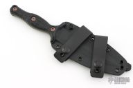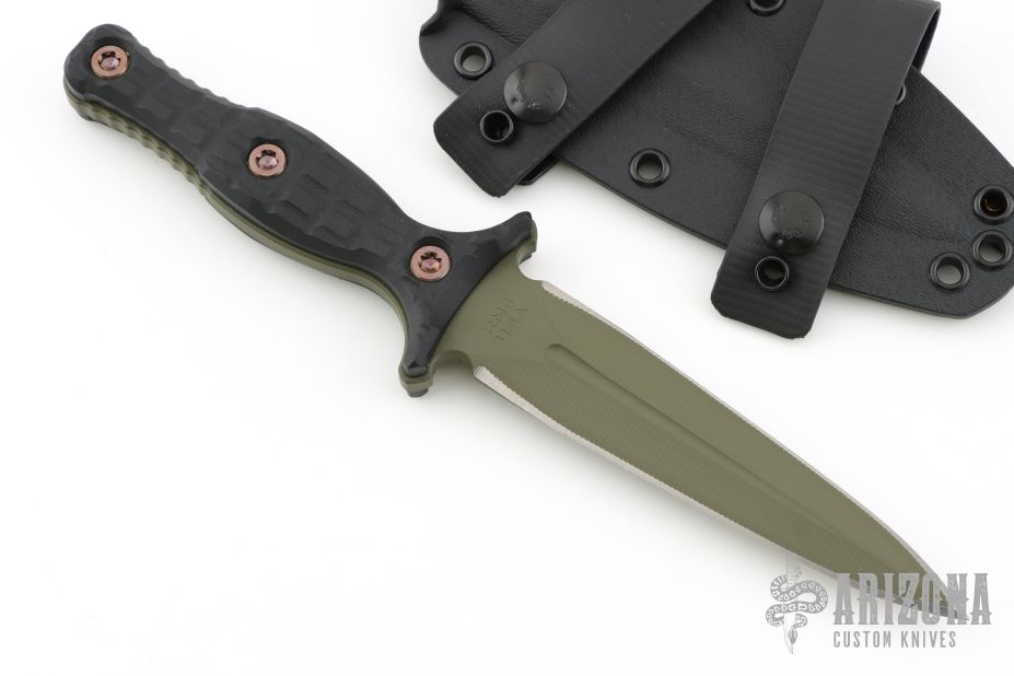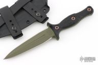 This Raider Dagger by RMJ Tactical features a milled green cerakoted double edged blade with fullers, .217" blade stock and 1.152" blade depth, full tang construction. The handle has frag pattern G-10 scales with notched on tang of blade. Comes with original box and kydex sheath. Has a few light sheath scuffs, otherwise excellent condition.