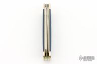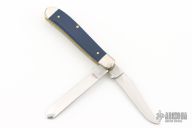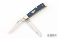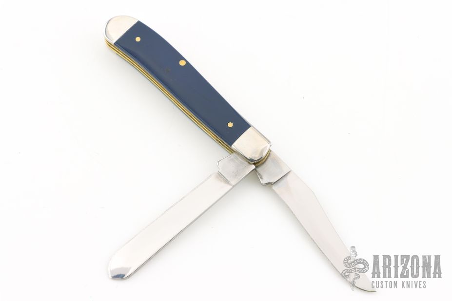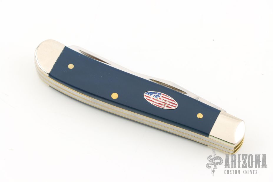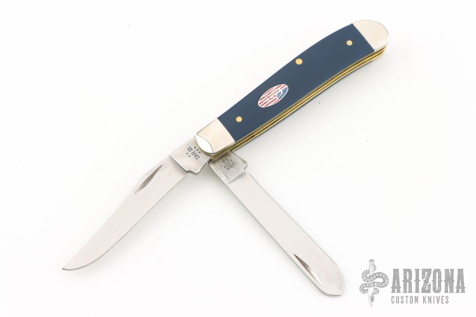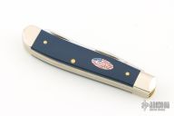 This USA Mini Trapper by Case features 2 mirror polished blades with nail nicks. The handle has nickel silver bolsters, navy blue synthetic scales, with an American Flag Case shield, brass liners and stainless springs. Comes with original box and papers. Excellent condition.