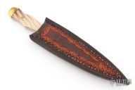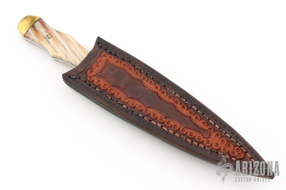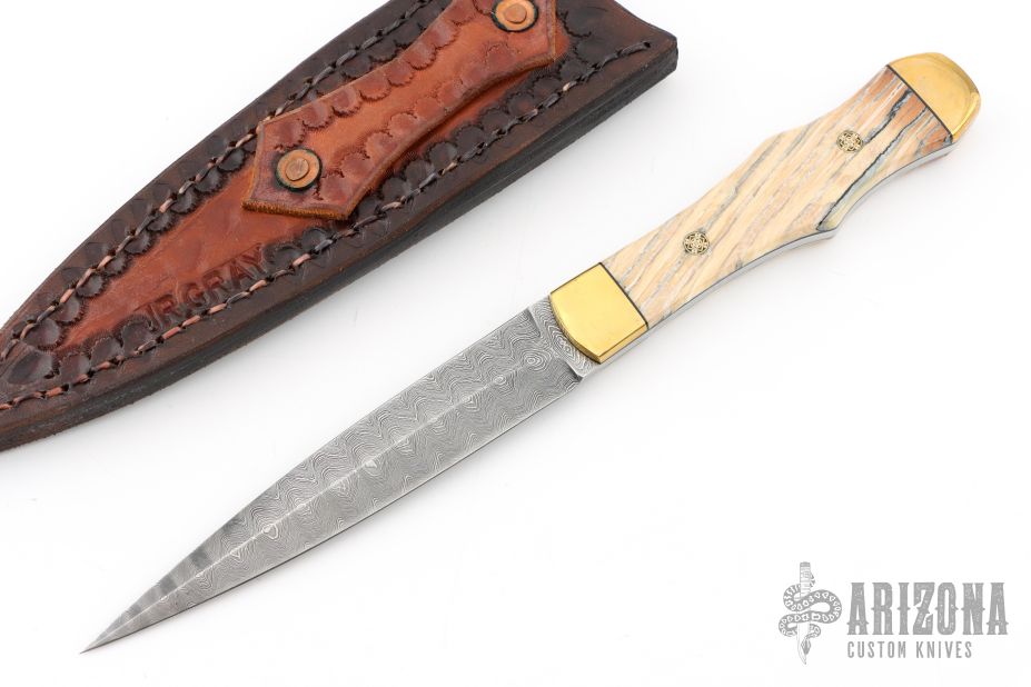 This fixed blade by JR. Gray features a Damascus double edge blade with 0.156" blade depth and .988" blade depth, full tang construction. The handle has brass bolsters, mammoth ivory scales, black fiber liners and mosaic pins. Includes a hand tooled brown leather sheath with belt loop. Also includes signed COA from maker. Has some scuffs and patina, otherwise excellent condition. "JR. GRAY '06" on the underside of the tang.