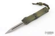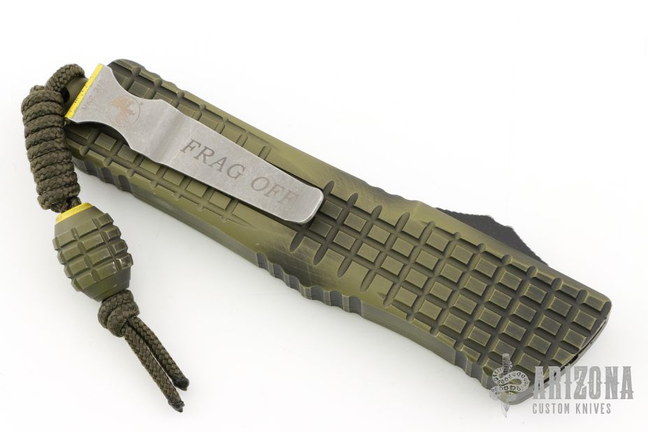 This Combat Troodon OTF automatic by Microtech knives features a double edged, Apocalyptic finished reverse full serrated blade. The handle has a grenade green frag pattern aluminum handle with black hardware, tip down carry. Glass breaker. S/N 312. Comes with original box and papers. Excellent condition.