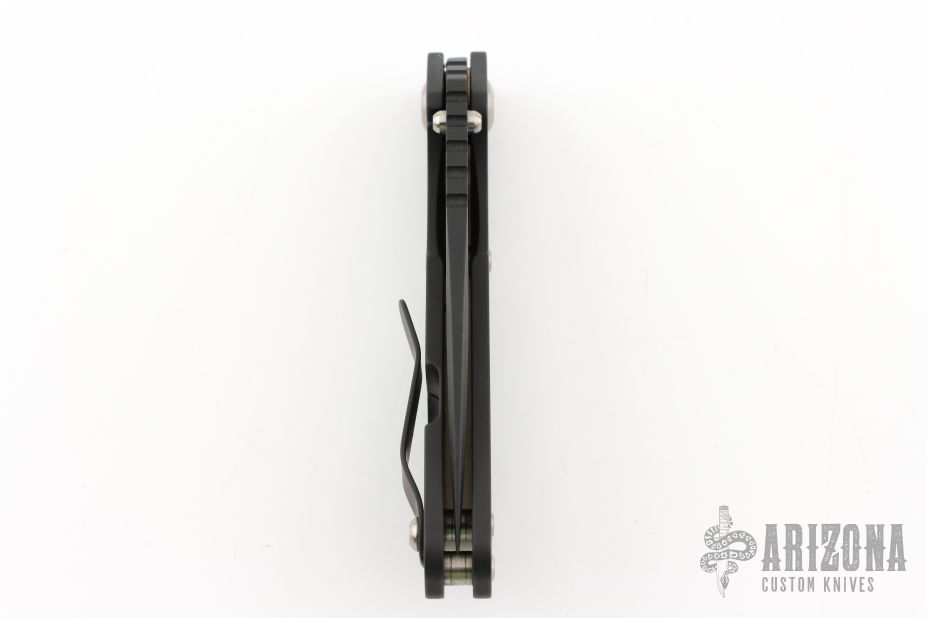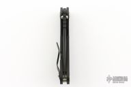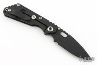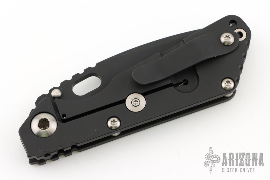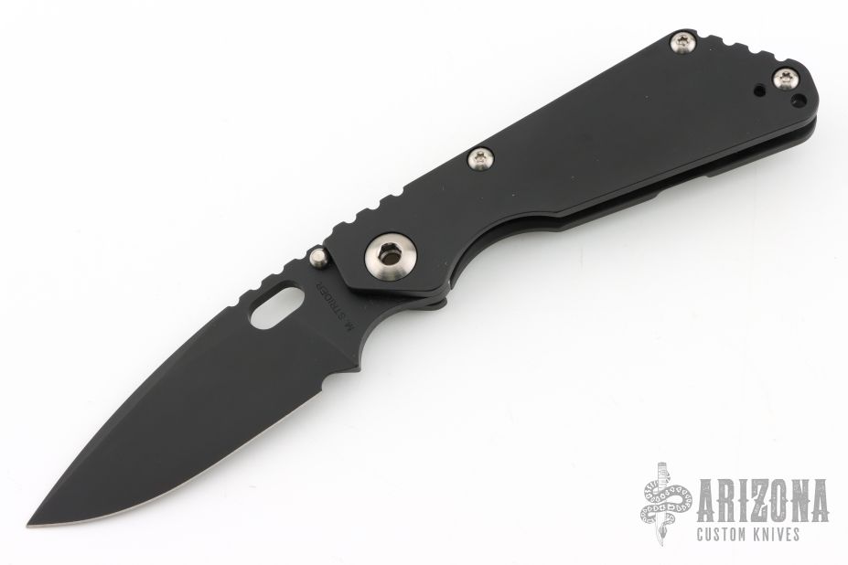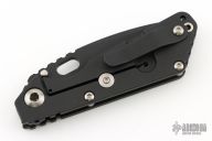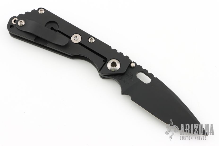This Mick Strider SNG framelock folder features a black drop point blade with thumbhole and notched thumbrest. The handle has a black titanium frame with titanium clip, tip up carry. Jimping on blade spine. Includes Hinderer "Lock Bar Stabilizer" for maximum reverse lock retention. Nice detent, lockup and blade seating. Excellent condition.  Comes with a zippered case.