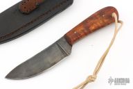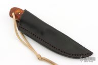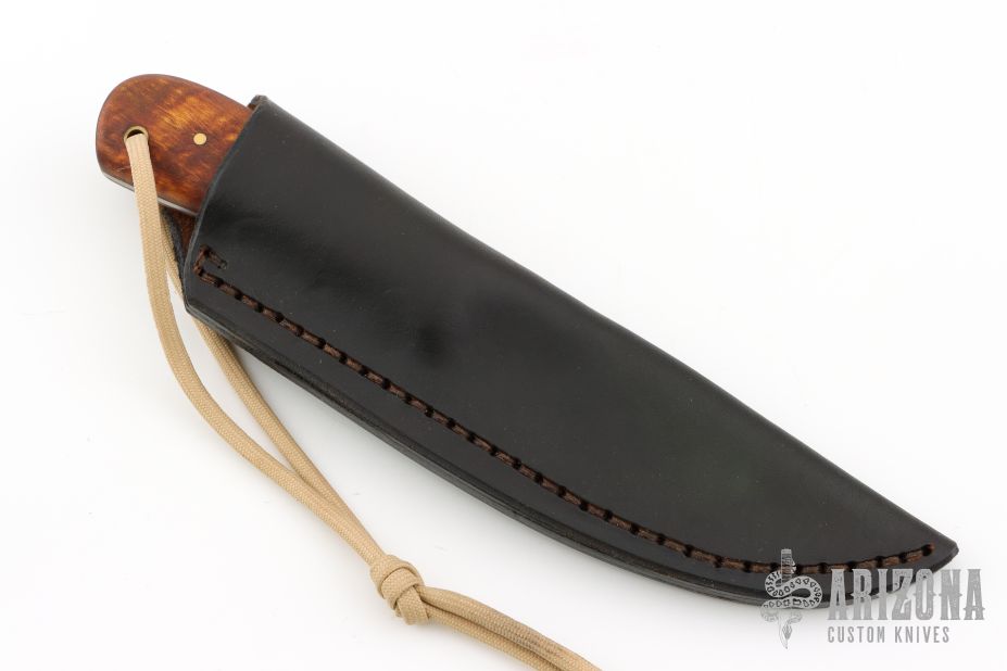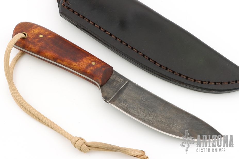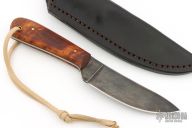 The knife by Lucas Forge, features a forged drop point blade with a full tang construction. .095" Blade Stock 1.372" Blade Depth. The handle consists of wood scales with brass pins. There is a lanyard hole towards the butt of the handle. Includes hand stitched brown leather sheath with belt loop. Has some scuffs and scratches, excellent condition.