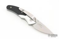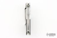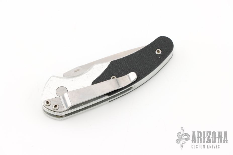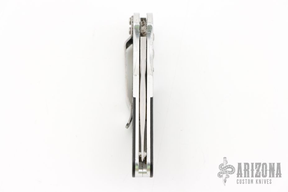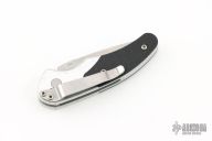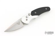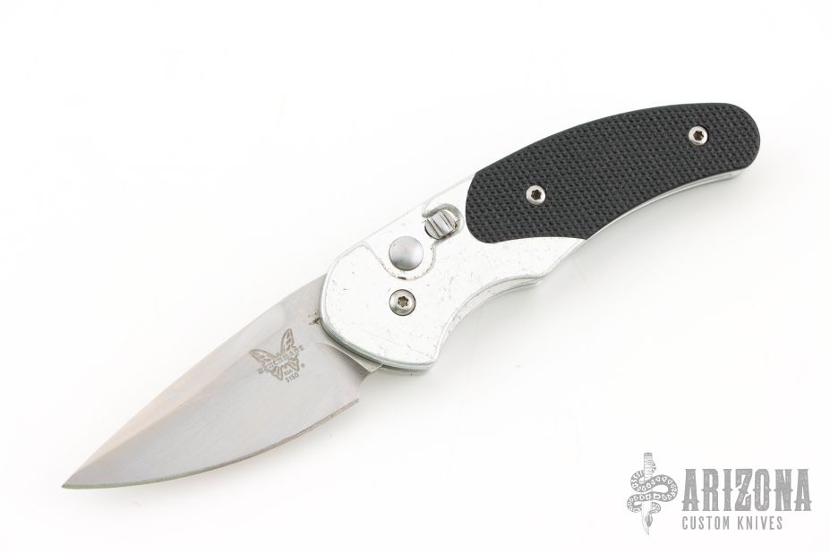 This 3150 Impel Automatic by Benchmade features a drop point blade with swedge. The handle is comprised of an aluminum frame with black G10 overlays. Push button and sliding safety on "A" side of handle The polished steel pocket clip is positioned for tip down carry. Has some scuffs and scratches, good condition otherwise.