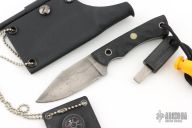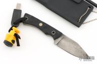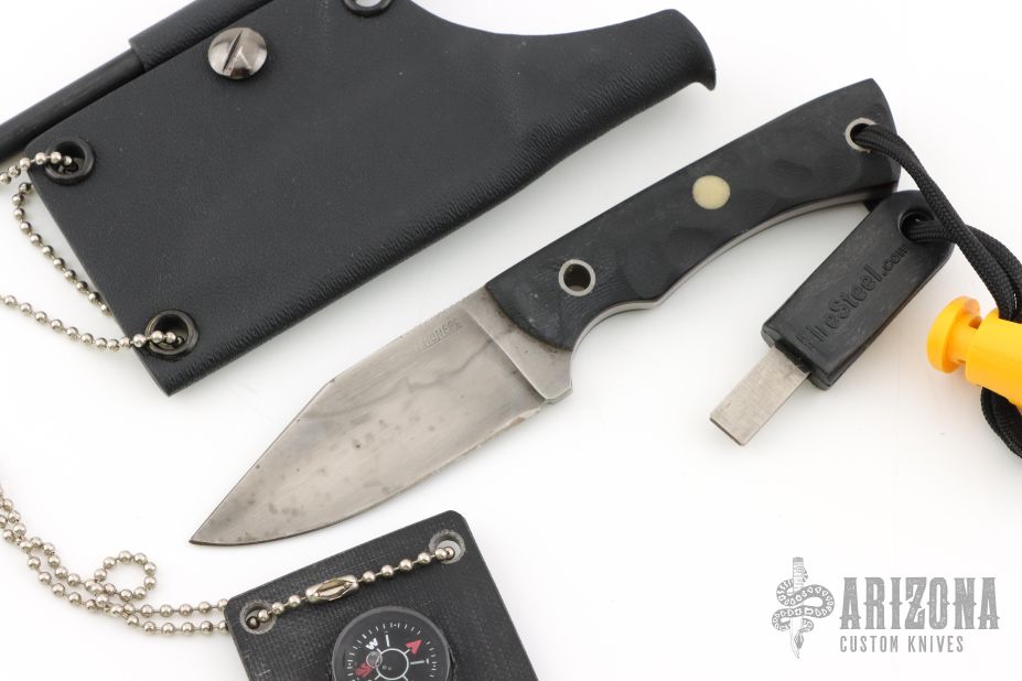 This large PSK by Jonathan McNees features a satin blade with hamon, notched thumbrest, .142" blade stock and .982" blade depth, full tang construction, handle has textured g10 covers. Comes with kydex neck sheath. Comes with sheath, fire steel, compass, mirror, and whistle. The knife has scuffs, scratches, and shows wear. Good condition otherwise.