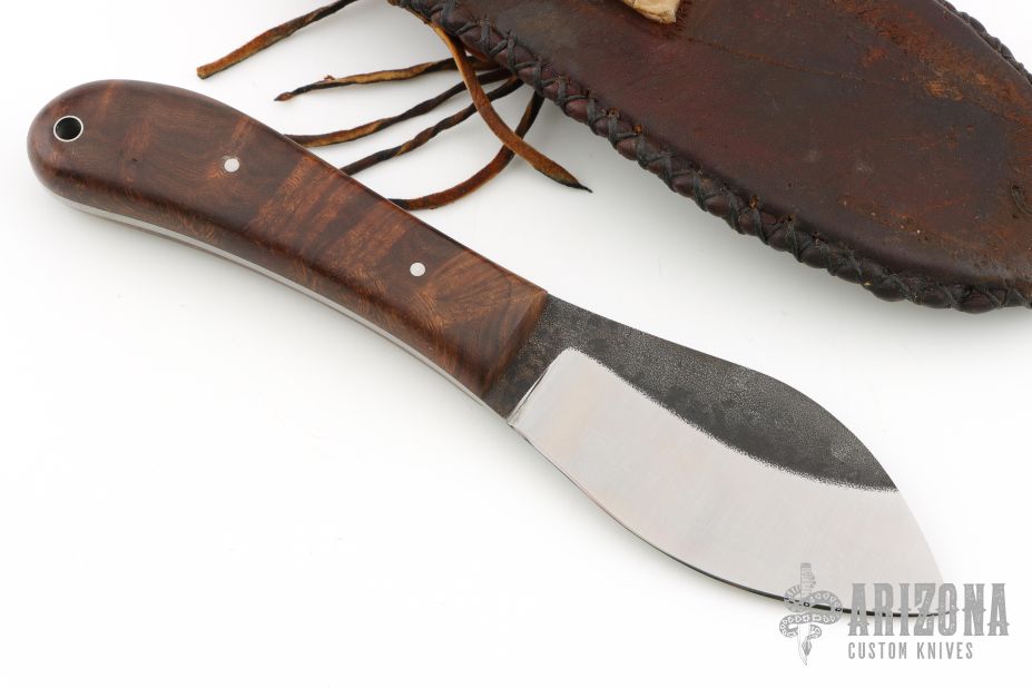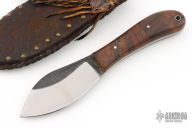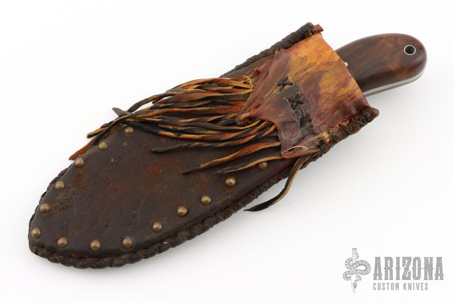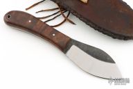 The knife by Wolf Creek Forge, features a forged drop point blade with a full tang construction. .146" Blade Stock 1.778" Blade Depth. The handle consists of wood scales with pins. There is a lanyard hole towards the butt of the handle. Includes hand stitched brown leather sheath with belt loop. Has some scuffs and scratches, excellent condition.