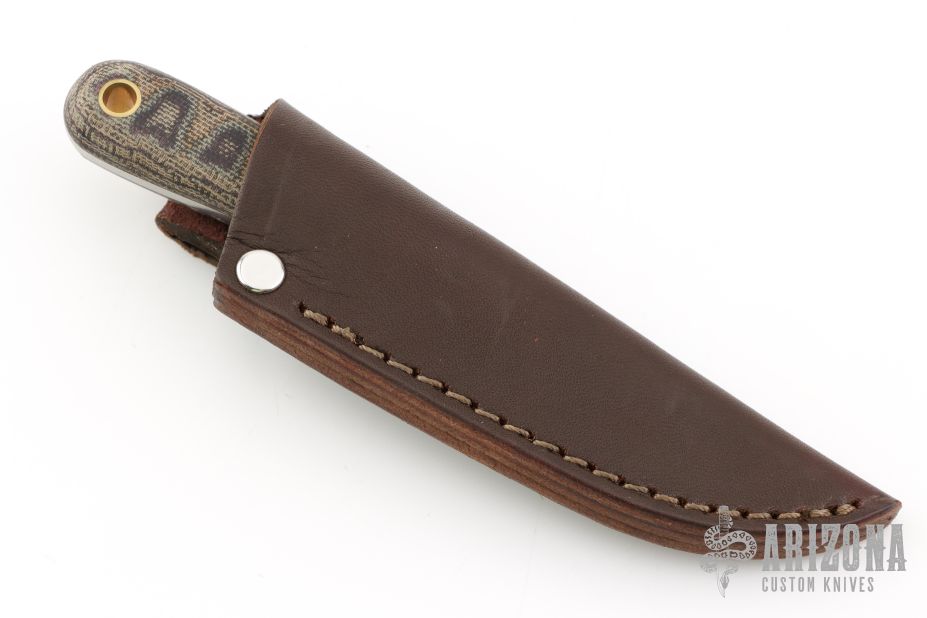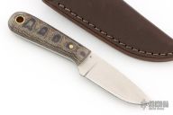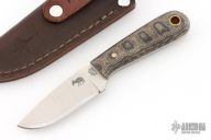 This knife by LT Wright features a satin finished flat ground blade with .119" blade stock and .855" blade depth, full tang construction. The handle has canvas micarta scales with brass pins. Comes with original box and brown leather sheath. Excellent condition.