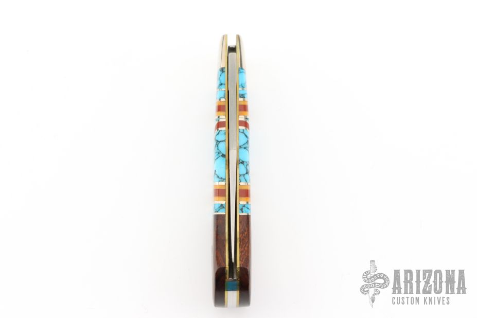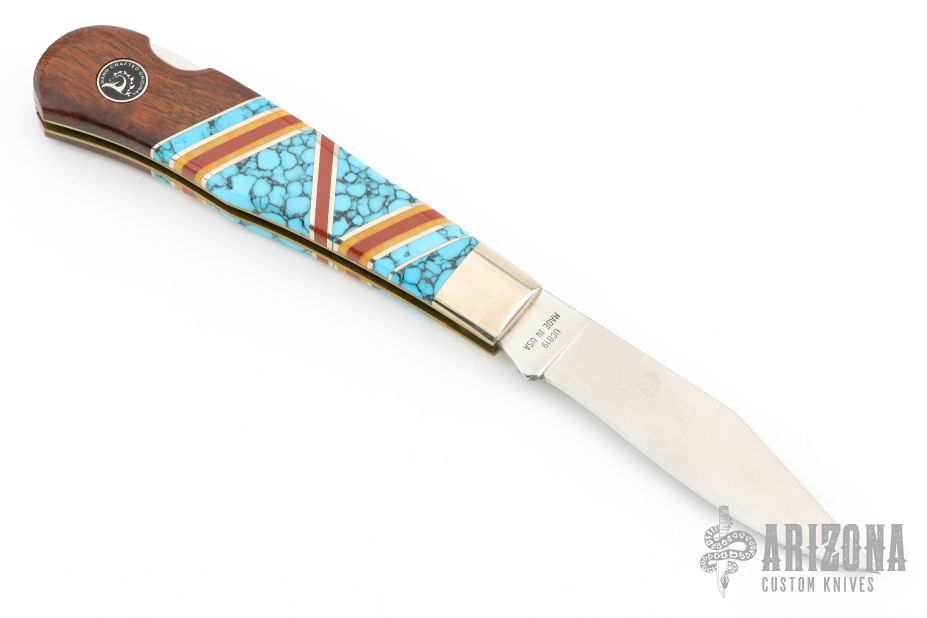 Features nickel silver bolsters, native turquoise and wood scales, brass liners, and stainless steel springs. Custom handle by David Yellowhorse. Includes original wood display case. Excellent condition.