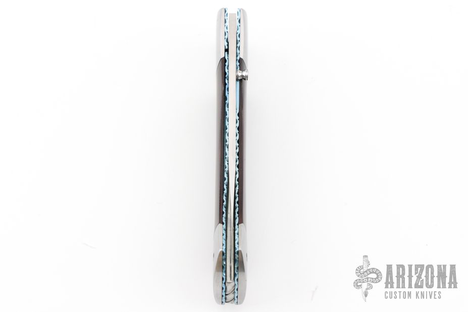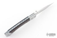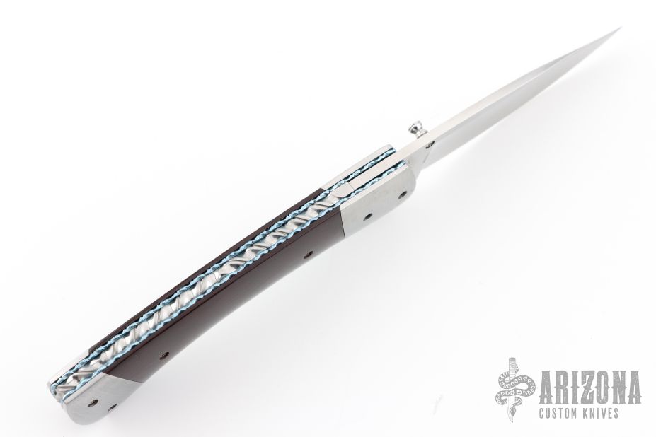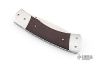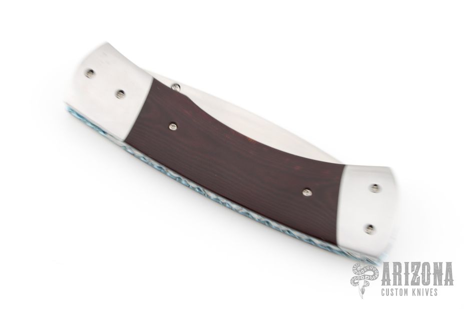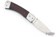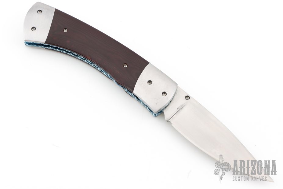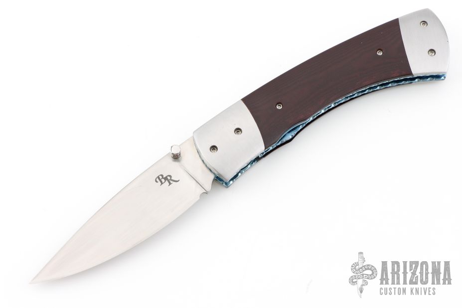 This linerlockfolder by Brandant Robinson features a hand rub satin finished blade with dual thumbstuds. The handle has dovetailed stainless bolsters, front and rear, maroon linen micarta scales, anodized titanium liners and steel backstrap. The liners, and backstrap have been file-worked. Nice detent, lockup and blade seating. Has a couple light scratches, excellent condition.