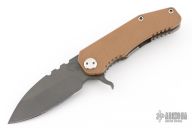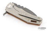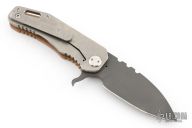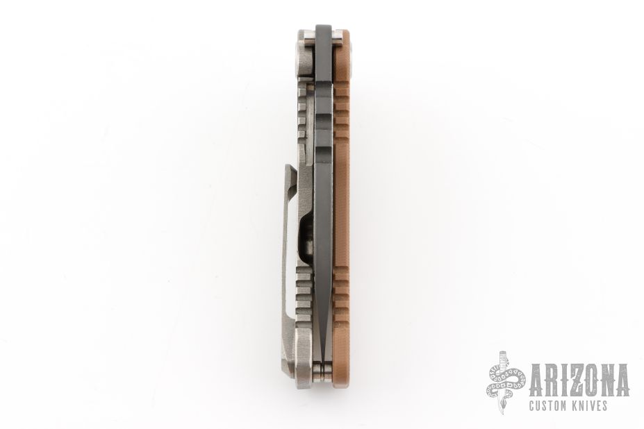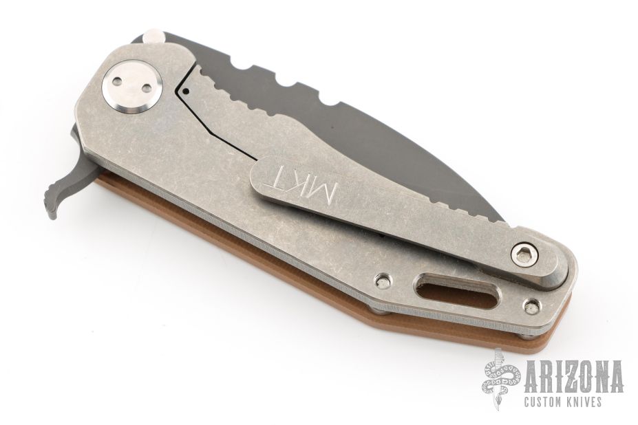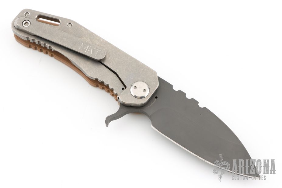 This 187F by Medford Knife and Tool features a gray PVD coated blade with notched thumbrest and flipper. The handle has a tumbled titanium lockside with Coyote Brown G10 scale and tip up titanium clip. Nice detent, lockup and blade seating. Comes with original box, drawstring bag and papers. Has some light scuffs and scratches, otherwise great condition.