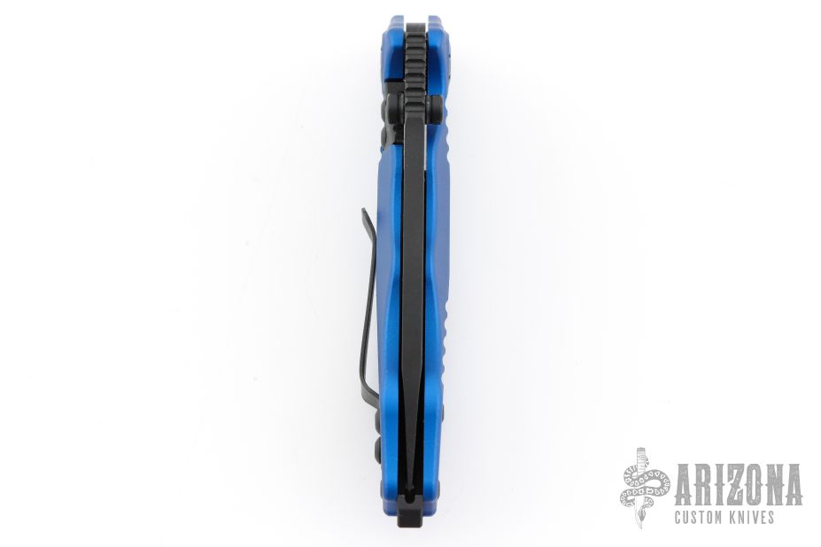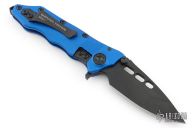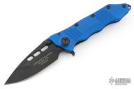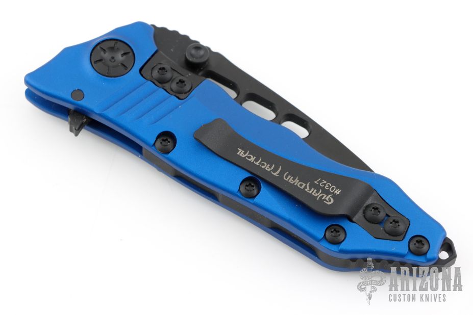 This Helix Nano by Guardian Tactical features a black drop point blade with dual thumbstuds, flipper, and notched thumbrest. The handle has a blue aluminum frame, black steel backspacer and tip up clip. Dated 05/2016 s/n 0327. Nice detent, lockup and blade seating. Includes the original box and papers. Has a few light scuffs on the blade, excellent condition otherwise.