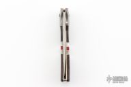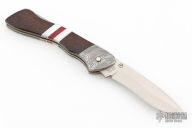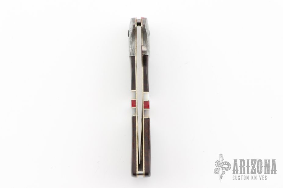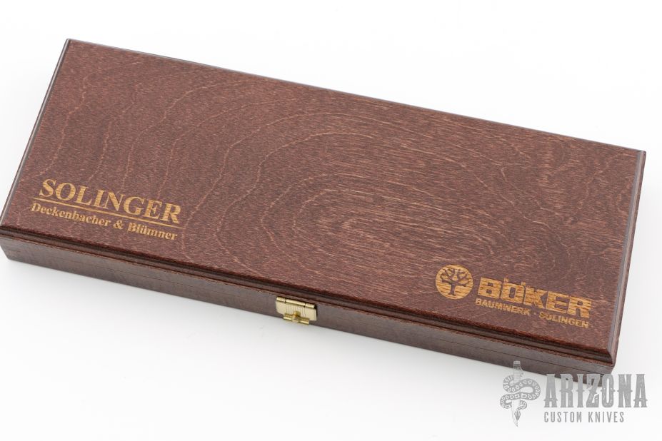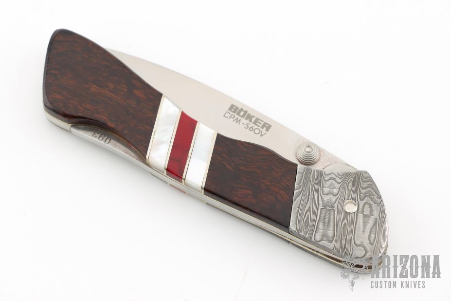 This knife by Boker features a satin finished recurve blade with thumb stud. The handle has Damascus bolsters, nickel silver liners, nickel silver spacers, pearl spacers, wood covers, and stainless rocker bar. Comes with original wood display box, and papers. Has some light scratches, otherwise excellent condition.