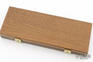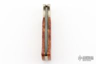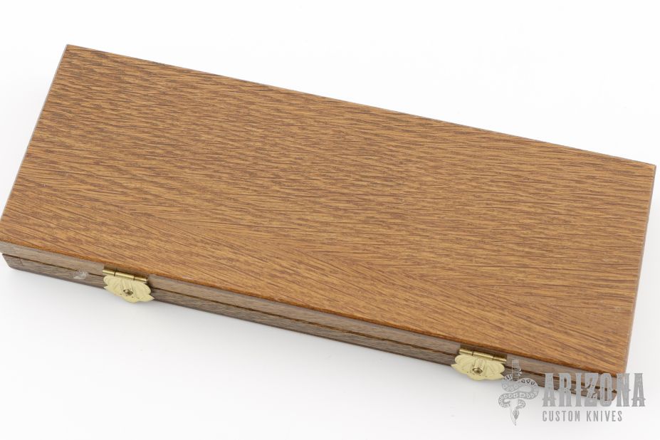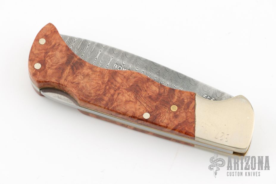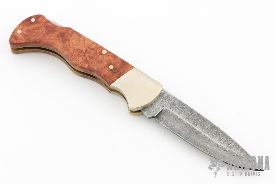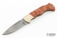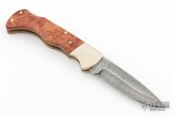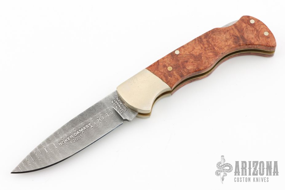 This Damast 2001 Lockback #327 has a Damascus drop point blade. Handle is wood over brass liners and stainless steel spacer/ lock, and satin finished nickel silver bolsters. Perfect lockup with zero blade play, and dead center blade seating. Comes with original wood presentation box. Has a few light scratches, excellent condition otherwise.