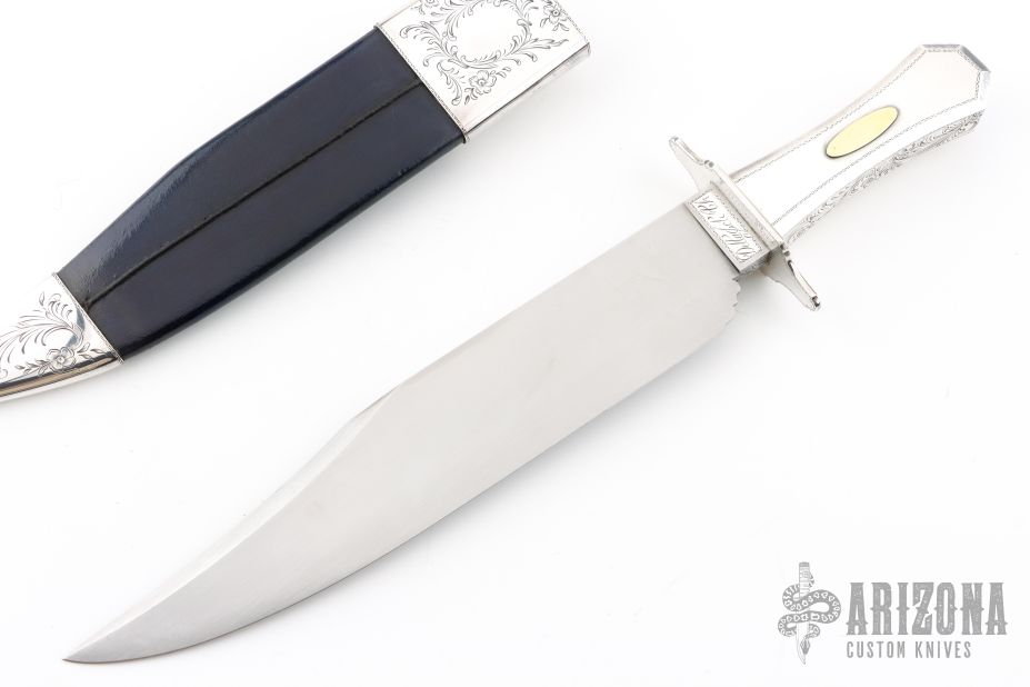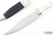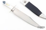 This Bowie by Judson Brennan and Sons features a hand rub satin finished blade with false top edge, .452" blade stock and 1.880" blade depth, hidden tang construction. The blade has sterling silver inlays in the ricasso and blade spine that have been engraved. The handle has engraved sterling silver guard, engraved sterling silver grip with gold escutcheons and an engraved tang nut. The ricasso of the blade is engraved with "J Brennan and Sons" on one side and "Delta Jct Ak" on the other, engraved under the ricasso with "No. 16". Comes with an engraved sterling silver and black leather sheath with belt stud. Has a few extremely fine scratches, otherwise excellent condition. Comes with a zippered case.