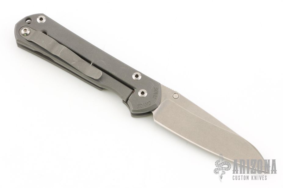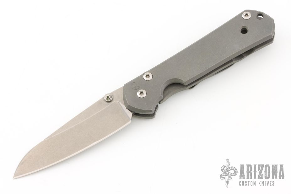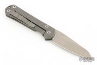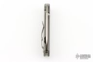 This Small Sebenza 21 by Chris Reeve features a tumbled blade with a single thumbstud. The frame has a bead blasted titanium with matching tip up clip. Silver thumb lug and spacer. Nice detent, lockup and blade seating. Comes with original box and papers dated June 19, 2012. Has scuffs and scratches throughout, good condition otherwise.