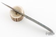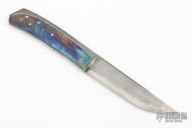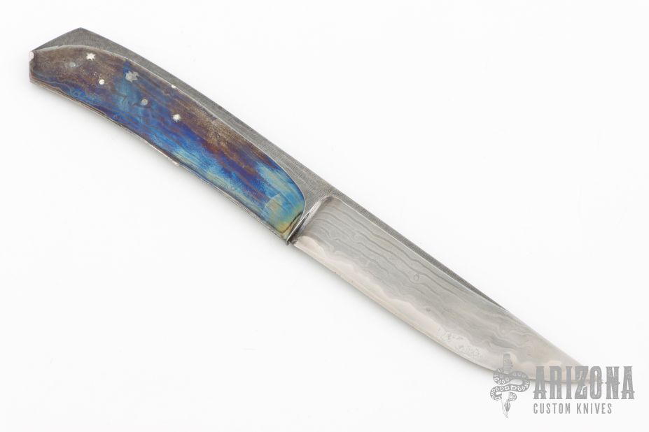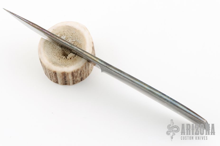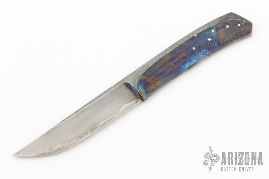 This knife is one piece made of San Mai Damascus with a lightly blued finish, .243" blade stock and .864" blade depth, integral construction. The handle has silver pin inlays near the butt. Comes with a wooden presentation box. Has a few light scratches, otherwise excellent condition.