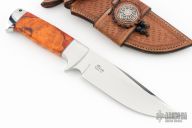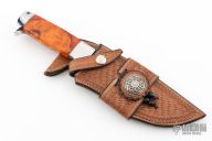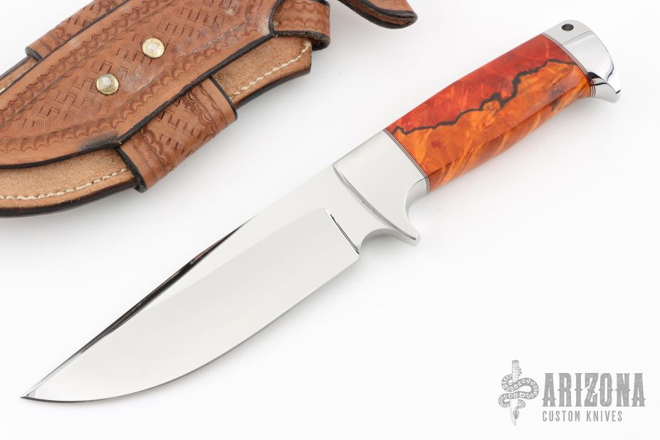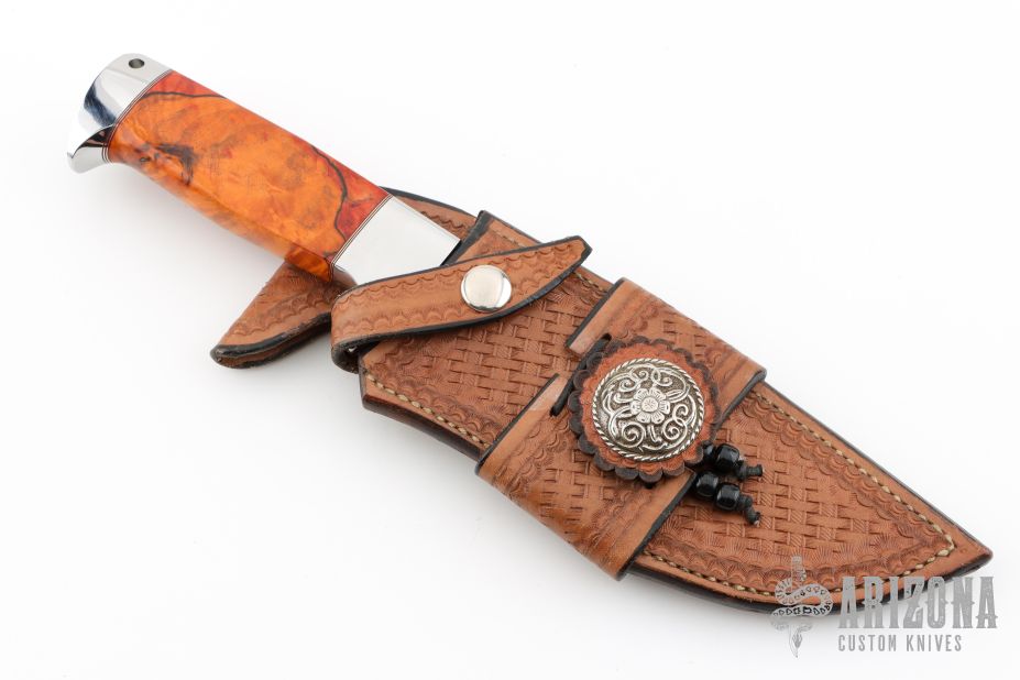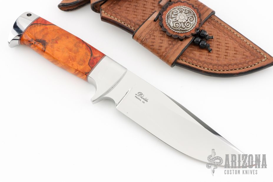 This Bowie by D'Alton Holder features a mirror polished blade with false top edge, .250" blade stock and 1.624" blade depth, hidden tang construction. The handle has a stainless steel guard and butt with lanyard hole, dyed and stabilized salted maple grip, red and nickel silver spacers. Comes with a hand tooled brown leather sheath. Has a small spot on the blade under the makers mark, otherwise excellent condition.