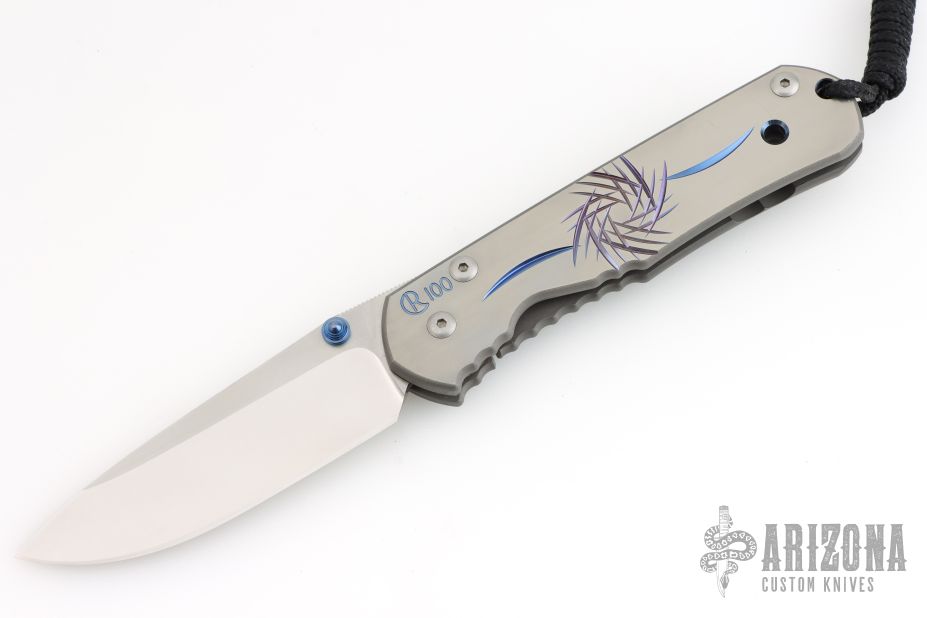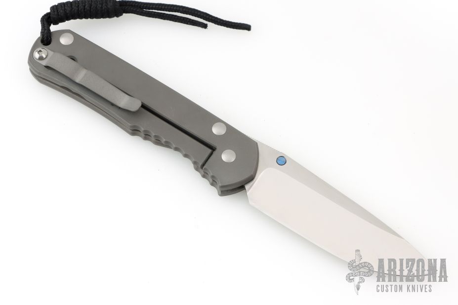 This large Sebenza by Chris Reeve features a satin polish finished blade with tumble finish flats and single anodized thumb stud. "Unique Graphic" milled titanium frame with bead blasted edges, lockside, satin finished flats on the show side, with bead blast finished titanium tip up clip. Comes with a Reeve Large Sebenza box, with Large Sebenza Card (wrong box/card), extra washers and lanyard. The knife has some scuffs and scratches, great condition otherwise.