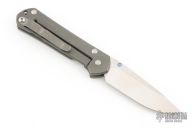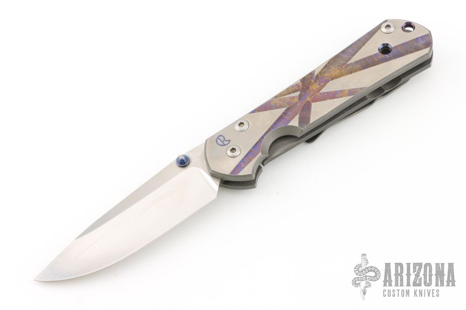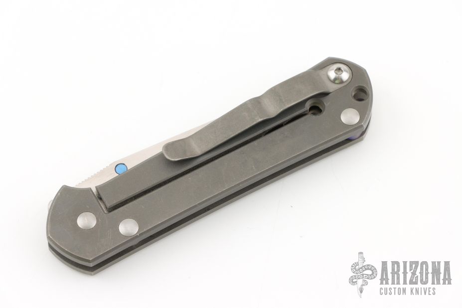 This Small Sebenza 21 by Chris Reeve Knives features a satin/polish finished drop point style blade with notched thumb rest and single anodized titanium thumb stud. The handle is comprised milled and anodized titanium and bead blasted titanium frame with matching tip up clip over a single anodized barrel spacer and lanyard hole. Has scuffs and scratches throughout, good condition.