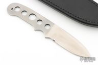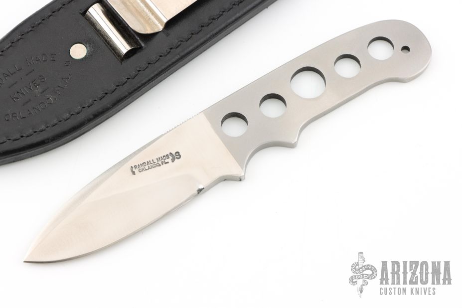 The Triathlete is a non-catalog knife by Randall Made Knives. It has a satin finished blade with notched thumbrest, .175" blade stock and 1.030" blade depth, integral construction. Notched thumbrest. Bead blast handle. Comes with black leather sheath with belt clip. Has a couple light scuffs and scratches, excellent condition otherwise.