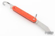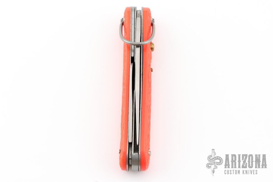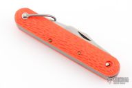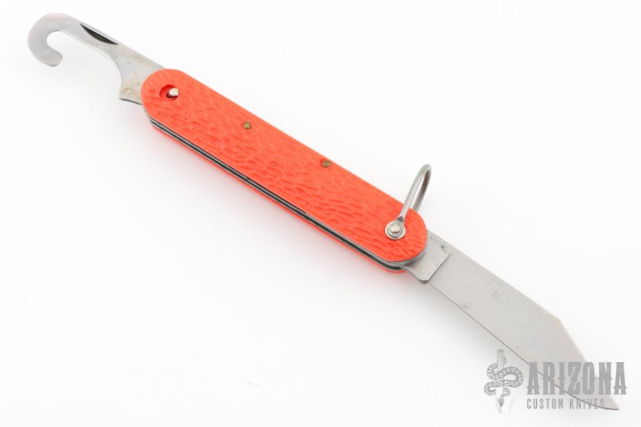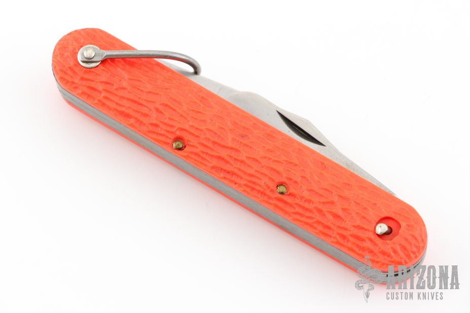 This knife by Schrade features a clip point blade. The handle has orange jigged scales, stainless steel liners and backspacer. Has Safety.  Has some blade play, and some light scratches. Excellent condition otherwise.