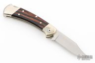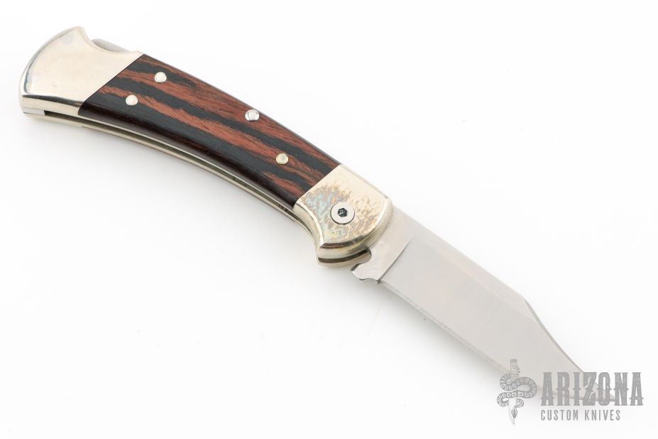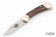 This Buck 112 Auto features a satin finished clip point blade. The handle has a nickel silver frame with wood scales. Comes with original box, papers and sheath. Has a couple light scuffs otherwise Excellent condition.