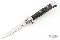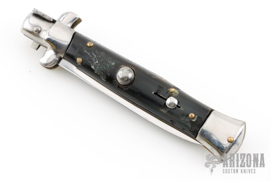 This leverlock auto by Hubertus features a mirror polished blade, nickel silver bolsters, mother of pearl scales, and brass liners and pins. Opens with a nice snap. Very fast opening. Has some light scuffs and scratches and a light patina, otherwise excellent condition.