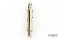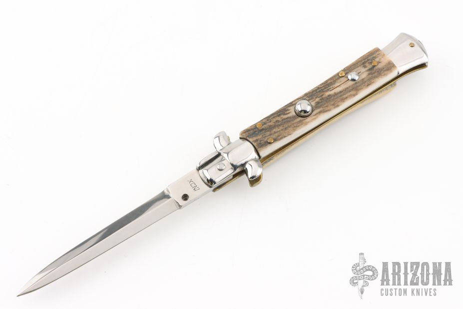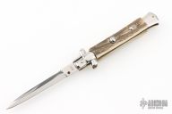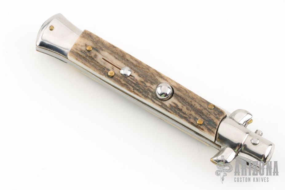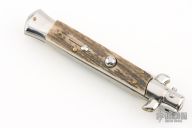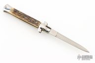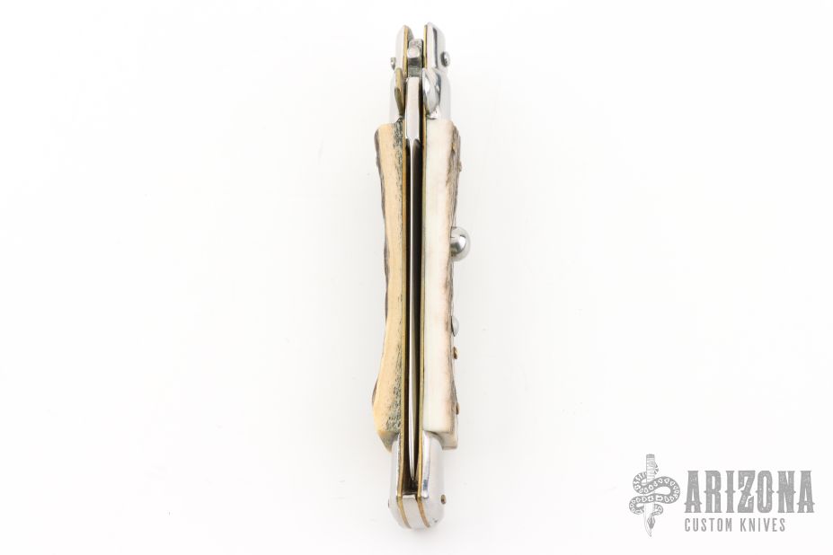 This Swivel Bolster features a dagger ground blade with false top edge. The handle is comprised of stainless steel bolsters and pommel with stag scales over brass liners and stainless steel backspacer. Has some light scratches and light blade play. Excellent condition otherwise.