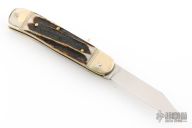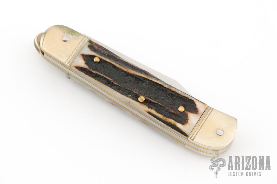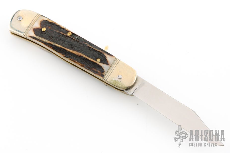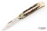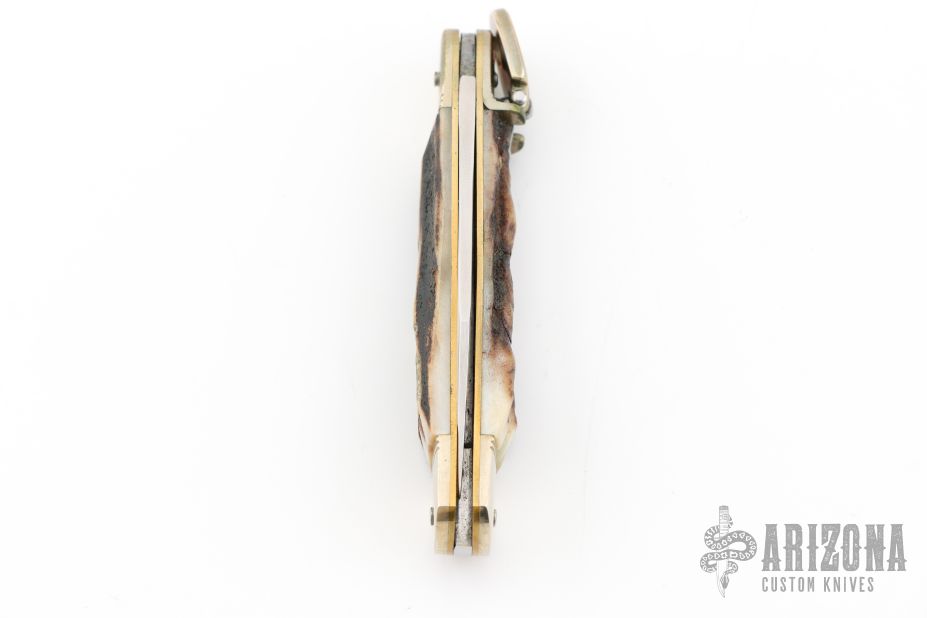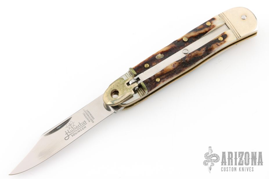 This leverlock auto by Hubertus features a mirror polished, clip point blade, nickel silver double bolsters, stag scales, brass liners and brass pins. Opens with a nice snap. Very fast opening. Has some light scuffs and scratches, great condition otherwise.