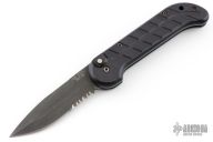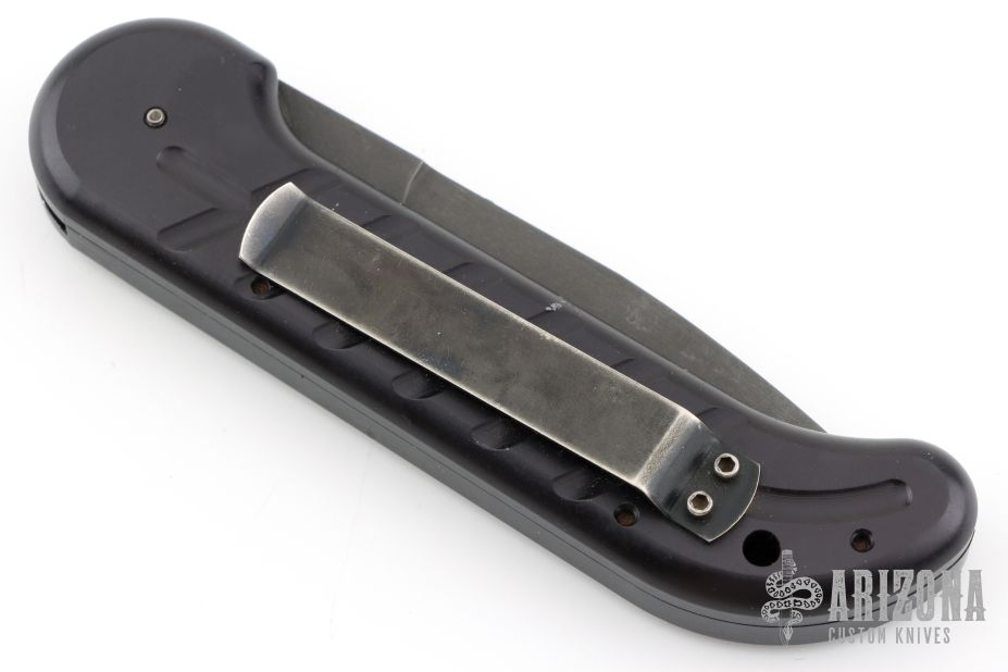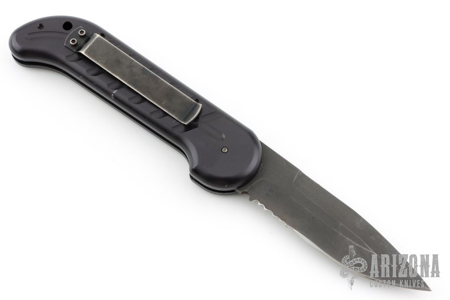 This Ox Enterprises / Charles Ochs coil-spring automatic features a black partially serrated blade and black anodized aluminum frame. Strong and fast opening. Nice function. Has a couple light scuffs, excellent conditon otherwise.