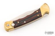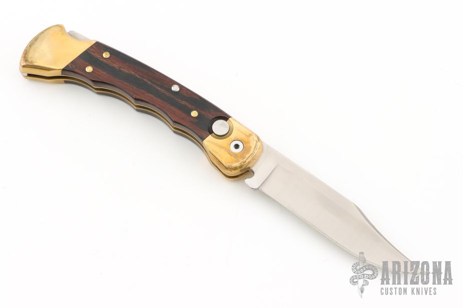 "This old classic BUCK knife 110 "Folding Hunter" was first introduced in 1965 - it has been BUCKS mainstay ever since. Some say the Buck 110 is the most copied knife in the world. This Buck automatic knife has a satin finished blade, spine and spring, wood scales, brass frame with finger grooves and a button that opens knife automatically. The listing is marked left handed because the button is normally on the other side of the knife. A must for any BUCK collection." Has light scratches, otherwise great condition. Comes with a black leather Buck belt sheath.