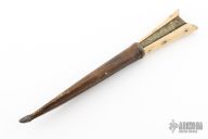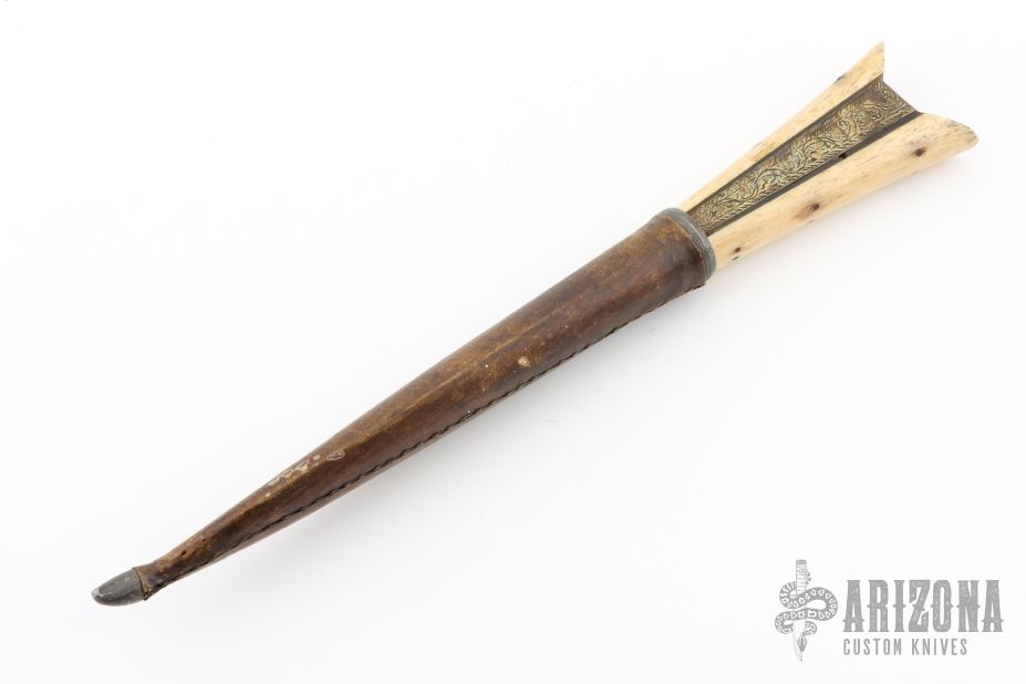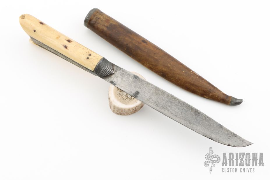 This Fixed Blade features a satin finished clip point blade with engraving on the blade and blade spine. 0.141" blade stock and .897" blade depth. The handle is comprised of an engraved guard with pinned horn scales over hidden tang construction. The frame of the knife is also engraved, and has a tang nut in the pommel. Includes a wooden scabbard. Native to the Greek island of Crete in the Mediterranean.