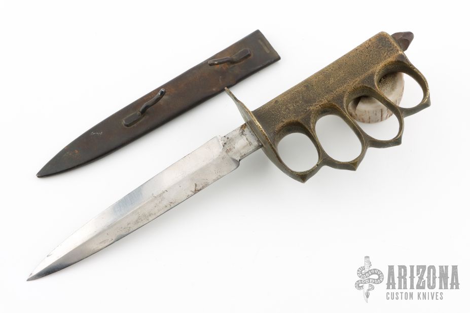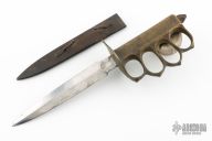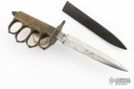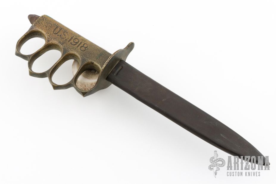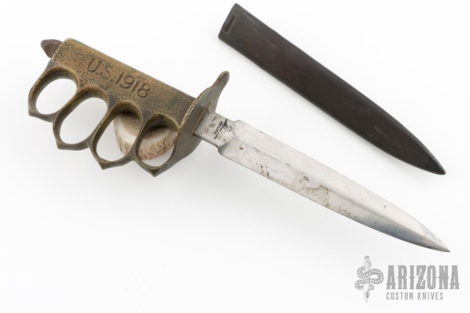 Extremely hard to find good examples. This is a WWI trench knife made by Au Lion, a French firm that helped to supplement the supply needed. Cast Brass handle with U.S. 1918 stamped. The blade is satin finished and double edged, .203" blade stock and 1.009" blade depth, hidden tang construction. Comes with original metal scabbard with tabs intact. Has some scratches and oxidation, otherwise excellent condition for its age.