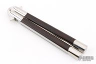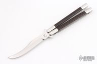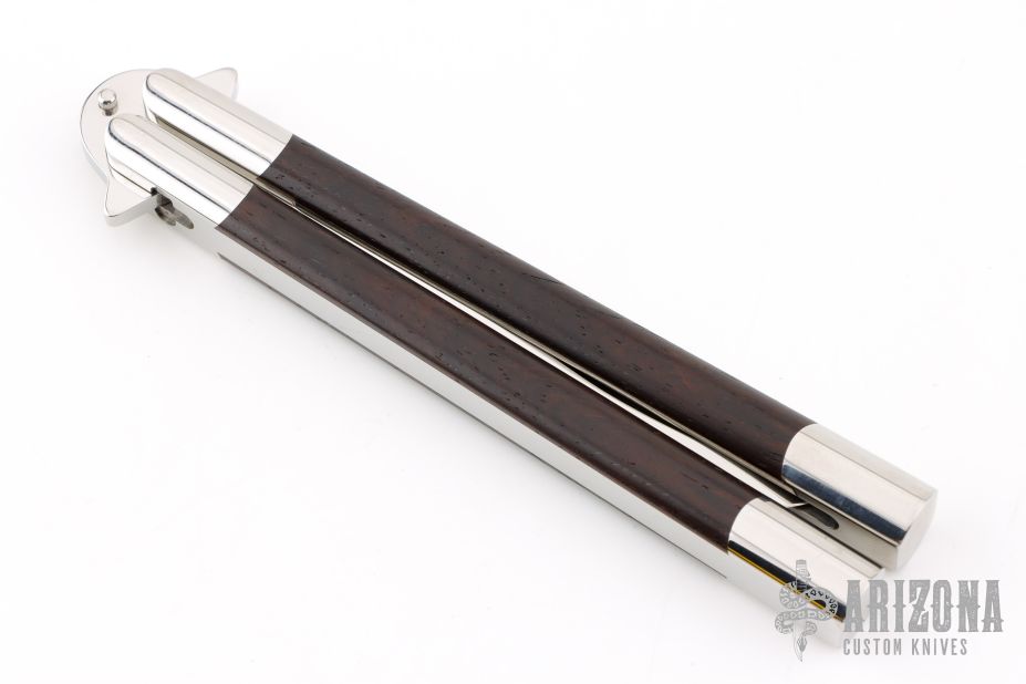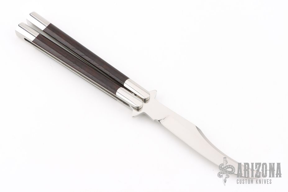 This balisong by 29 Knives features a mirror finished unswept Bowie blade. The handle has integral 303 stainless steel handles with cocobolo inlays. Includes a Velcro case and COA. Excellent condition.