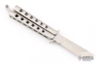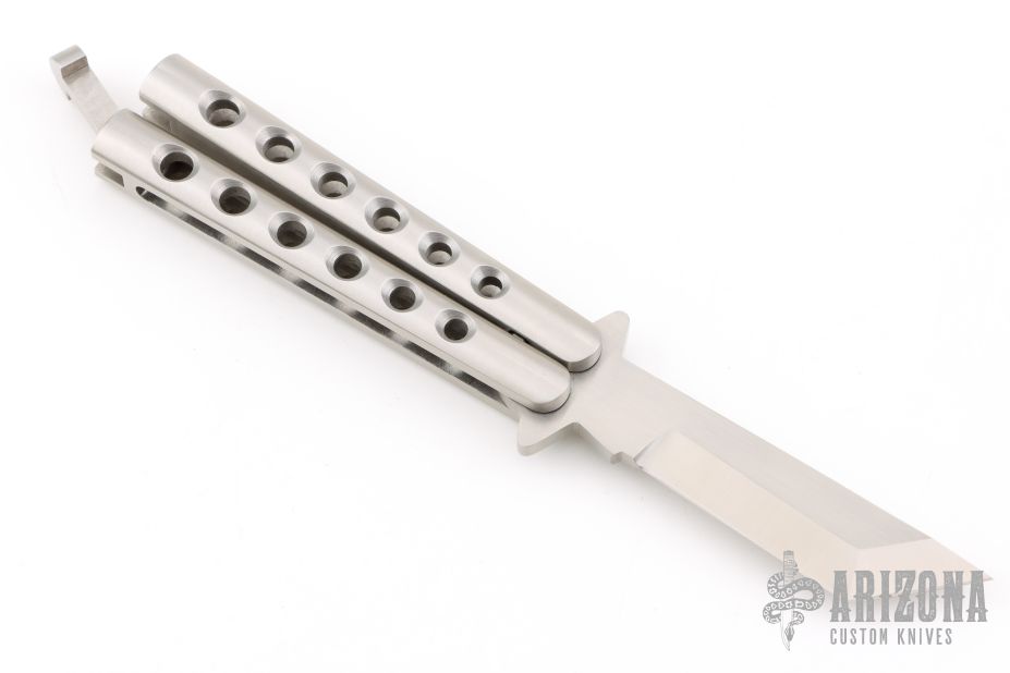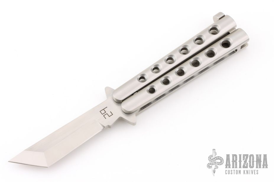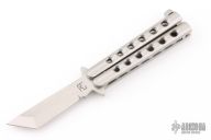 This balisong by 29 Knives features a satin finished tanto blade. The handle is composed of satin finished integral stainless steel with matching T-latch. Has a couple scratches, otherwise excellent condition. Comes with a velcro case.