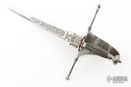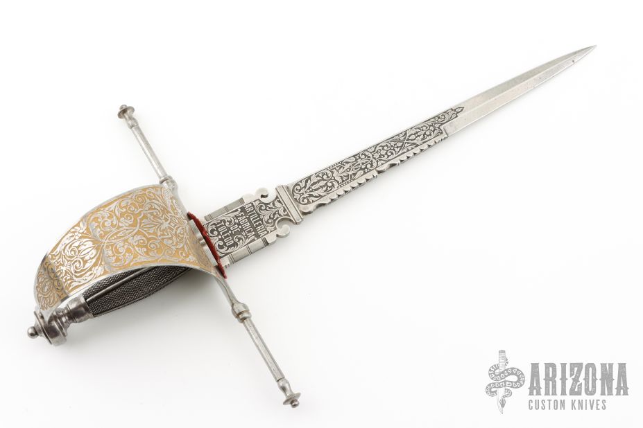 This dagger features a satin finished blade with etchings on both sides, .231" blade stock and 1.49" blade depth, hidden tang construction. The blade has a top edge, and file-worked blade spine. The handle has a pronounced steel crossbar with silver wire grip, steel pommel, and knuckle guard with etching. Has some light scratches and patina otherwise great condition.