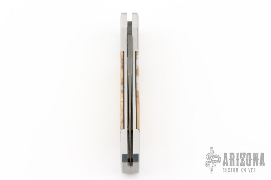 This Godson features a Damascus spear point blade. The handle has a steel frame, mosaic push button and mammoth ivory inlays. The frame has scratches on it, otherwise the knife is in excellent condition.