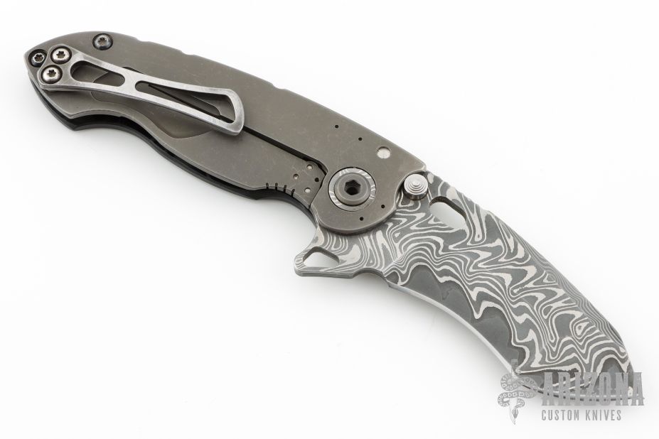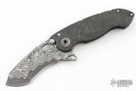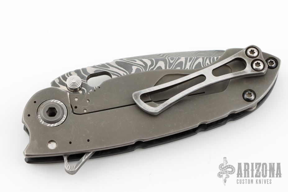 This Solo flipper by Direware features a Chad Nichols San Mai Damascus blade with notched thumbrest and flipper. The handle has a bead blasted titanium and marble carbon fiber frame, Damascus pivot collars, Damascus tip up pocket clip. Has scuffs and scratches, has been used and carried, has been sharpened, otherwise good user condition. Comes with box.