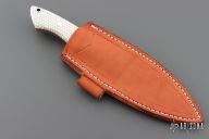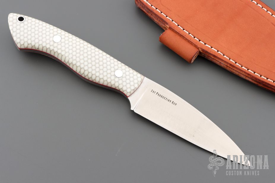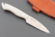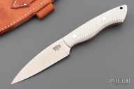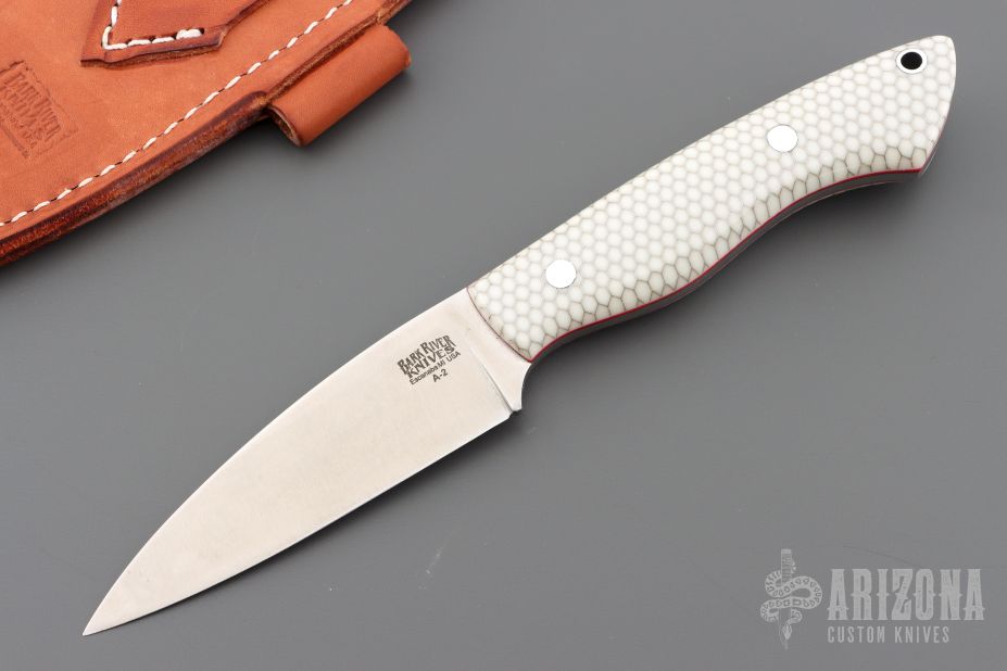 This Bush Seax by Bark River features a satin finished blade, .133" blade stock and 1.157" blade depth, full tang construction. The handle has white C-Tek scales with red G-10 liners and aluminum pins, lanyard hole at the butt. Comes with original box, papers, and leather sheath. 1st Production Run. Excellent condition.