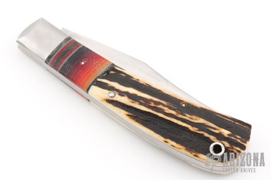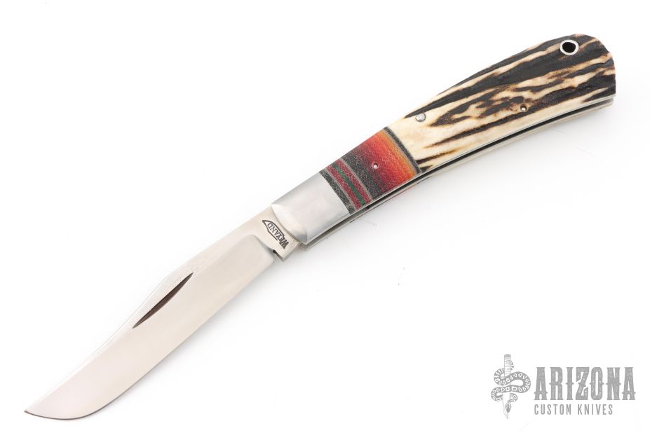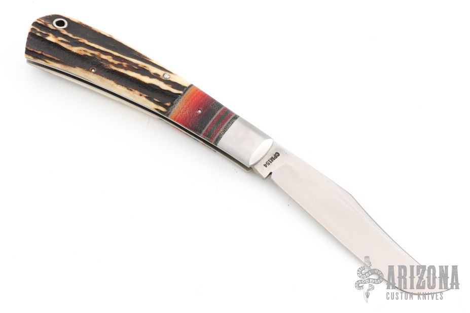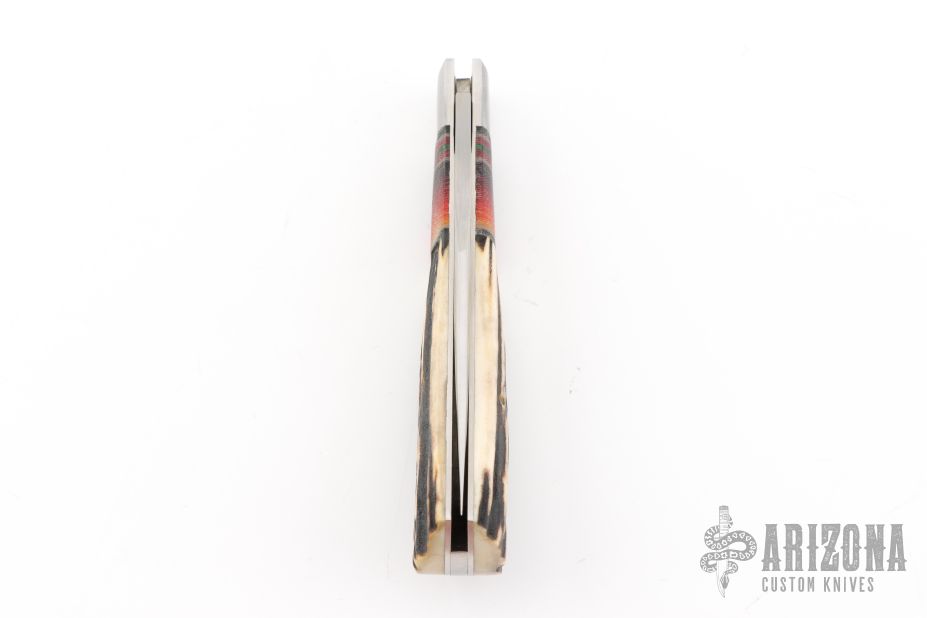 Derek Weyand, knife-maker and owner of Weyand Knives, LLC, began his knife making journey in 2013 making railroad spike knives. Since that time, Derek has progressed to making knives from other repurposed steels as well as known steels such as Alabama Damascus, 1084, 80crv2, 5160, D-2, CPM154, and stainless to name a few. Derek is never content with his skill; his craft is always changing and improving. In addition to handcrafting all of his leather sheaths, he also casts his own knife scales using pinecones, cholla cactus with Alumalite resin as well as stabilizes all of his antler. Derek has even begun to craft new leather products such as wallets. He is always working to improve his skill and challenge himself in whatever product he makes.