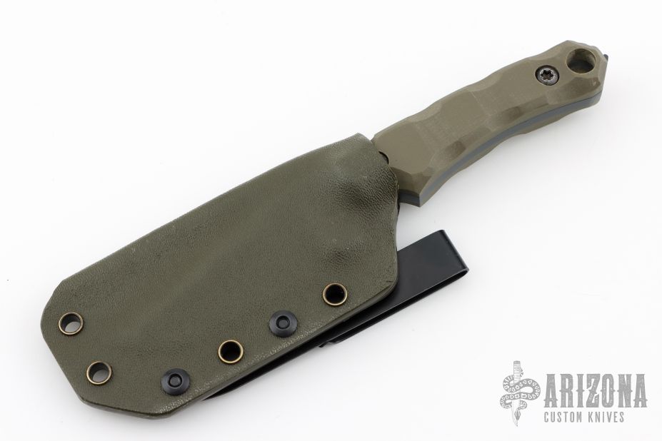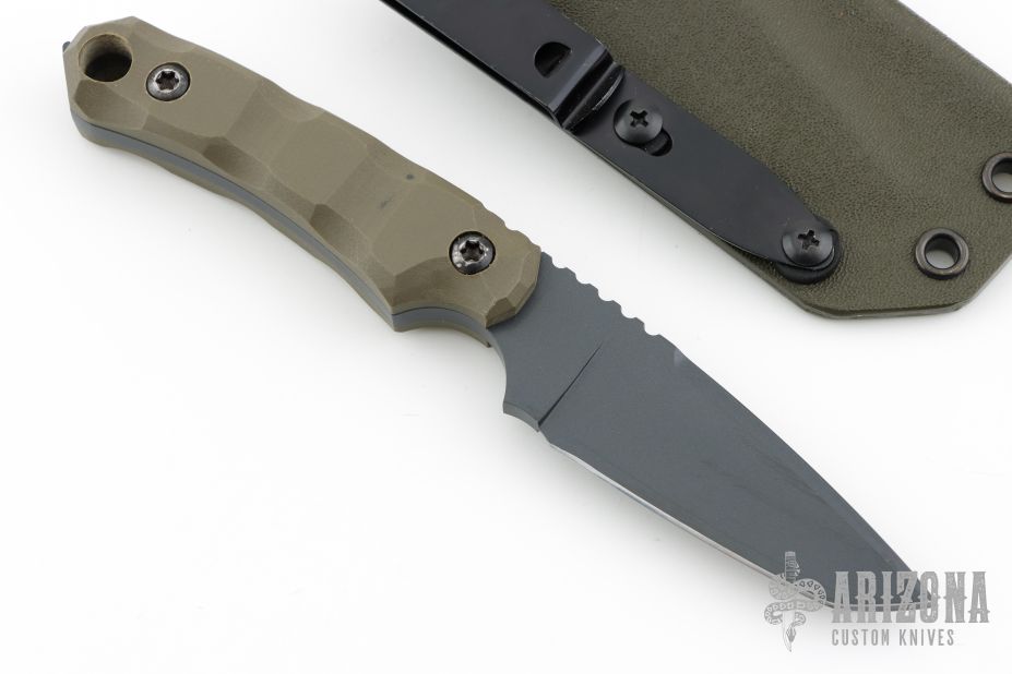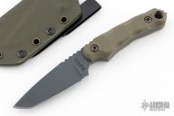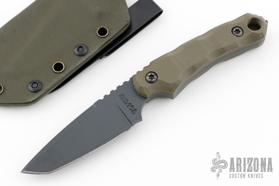 This Deimos from Krypteia Knives features a dark grey coated tanto blade with swedge and notched thumbrest, .207" blade stock and 1.088" blade depth, full tang construction. The handle has green G-10 scales with lanyard hole. Comes with kydex sheath. Has some light scratches, otherwise excellent condition.