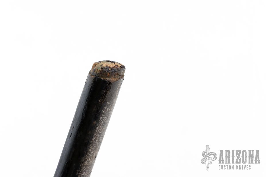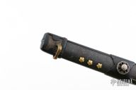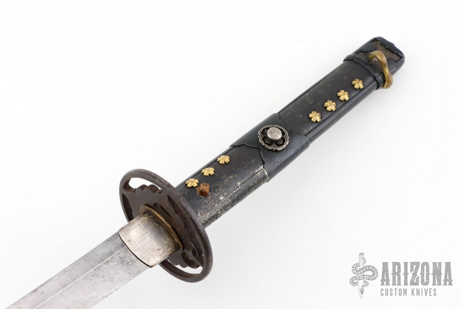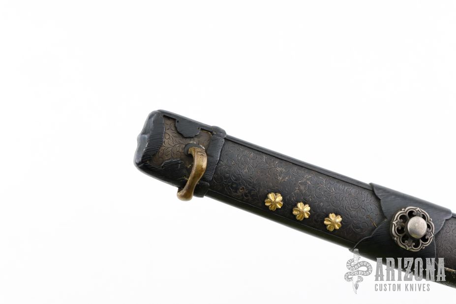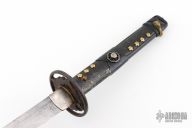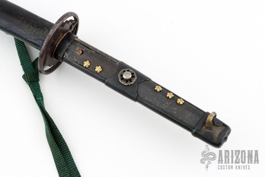 This Samurai Tachi is circa 1670s. The Otsuka/handle is covered in silver, and in shakudo (an alloy that includes up to 10% gold to produce a handsome dark blue color). Theis type of tsuka is associated with Court Tachi. Blade nagasa (length of cutting edge) 24-3/16". Mumei/unsigned. The Koshirae (mounts) are in excellent condition. The lacquer on the saya has some chips, the saya drag fitting is missing. These are all normal for a battle-carried sword that was later brought back by an American GI in his duffle bag. The blade is in original Japanese polish, with some small chips in the edge. A polish will fix all if the buyer decides to have that done. The hamon and boshi (temper) are healthy and complete.