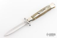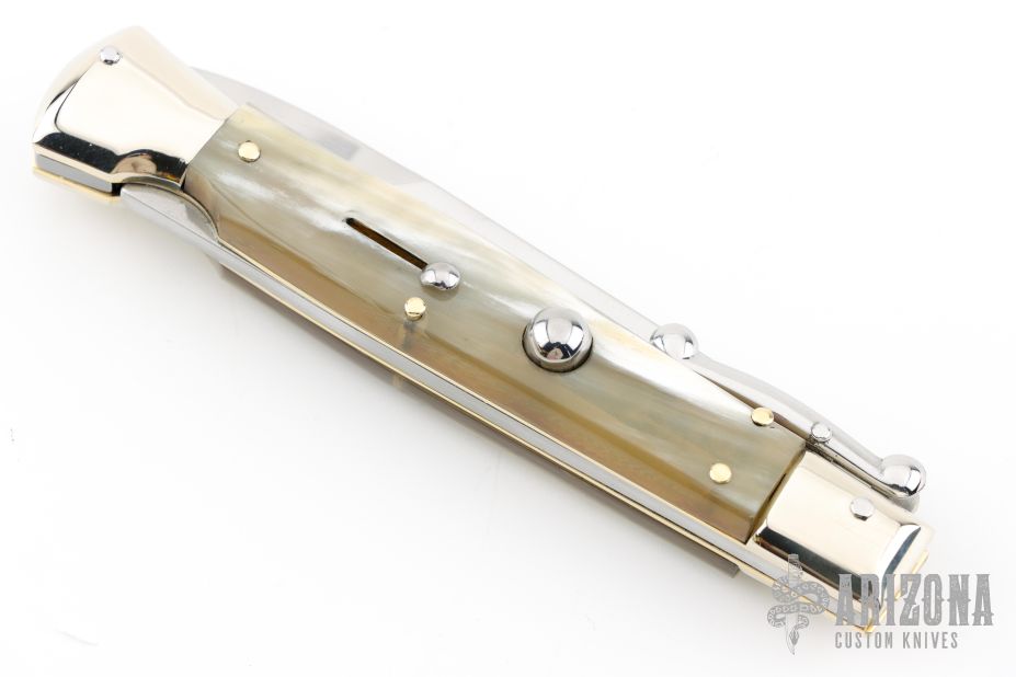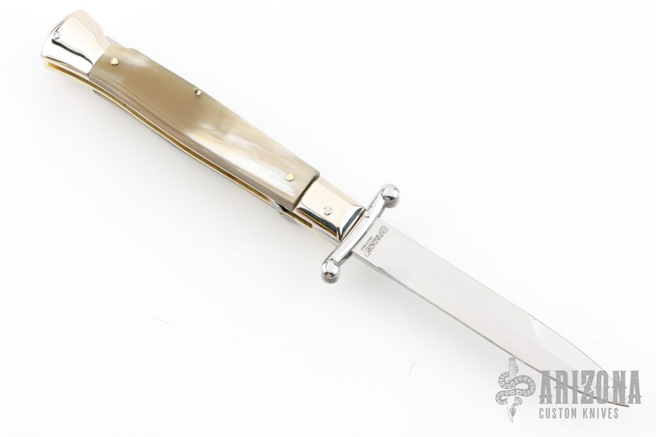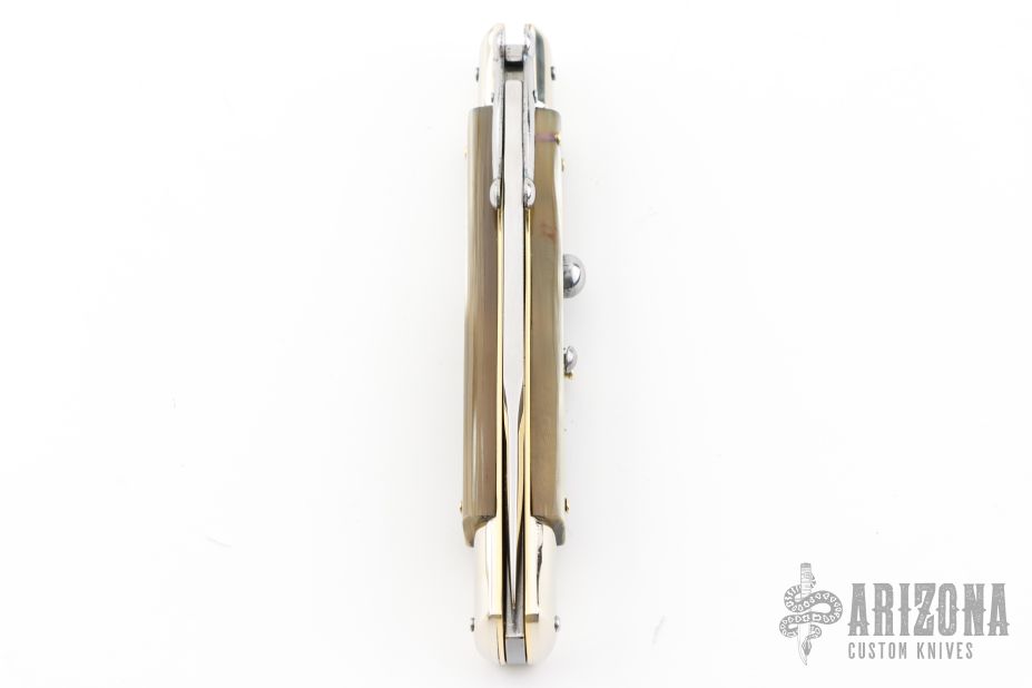 This Swing Guard Auto has a mirror polished bayonet ground blade with false top edge. The handle is composed of nickel silver front and rear bolsters, brass liners all complemented by horn scales. Excellent condition. Comes in maker's cloth pouch. Excellent condition. This one was tuned and polished by Greg's Effects and has a COA.