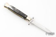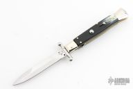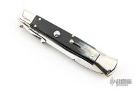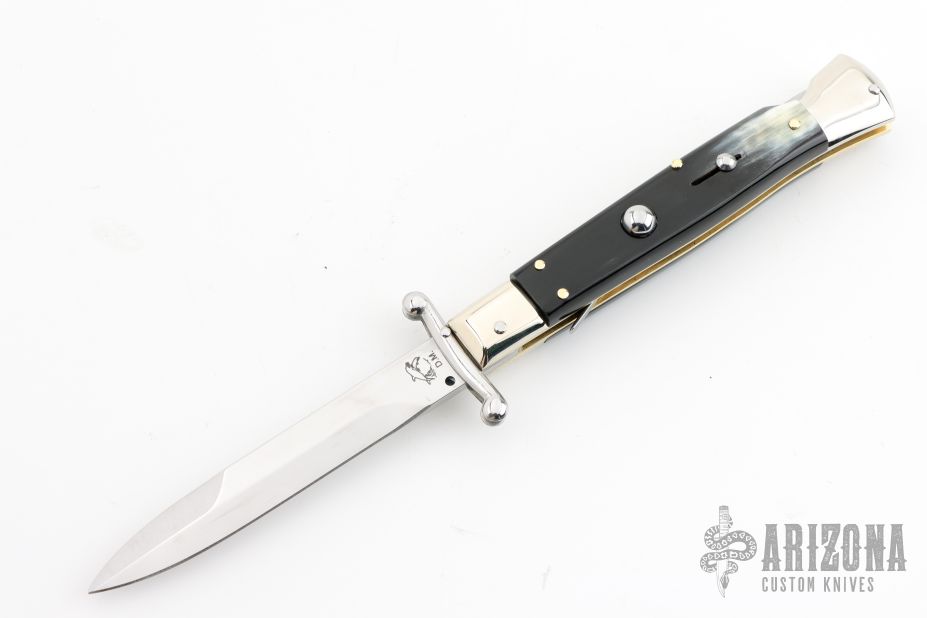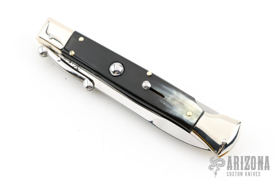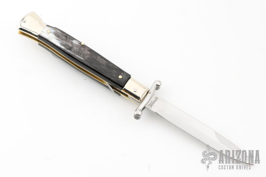 This Swing Guard Auto has a mirror polished bayonet ground blade with false top edge. The handle is composed of nickel silver front and rear bolsters, brass liners all complemented by horn scales. Excellent condition. Comes in maker's cloth pouch. Excellent condition. This one was tuned and polished by Greg's Effects and has a COA.